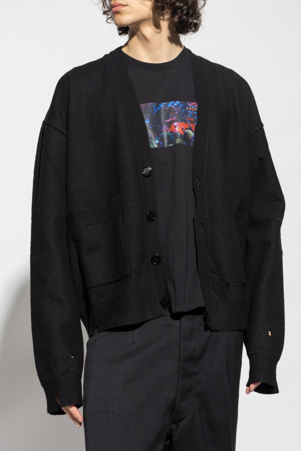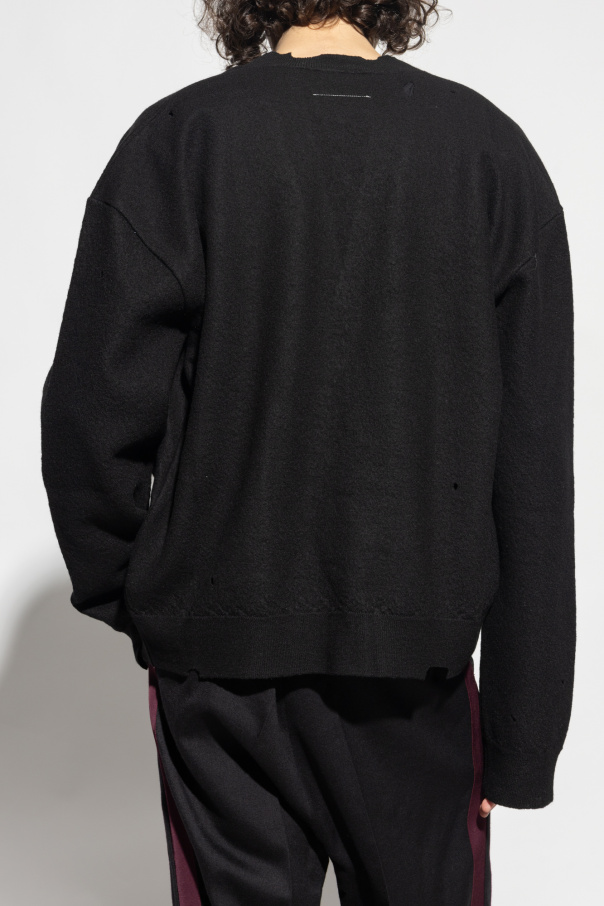 Black cardigan from MM6 Maison Margiela. Crafted from virgin wool with distressed details, this style features a V-neckline, button fastenings, two slip pockets, the brand's signature white four stitches on the back and ribbing on the collar, bottom hem and long sleeves.