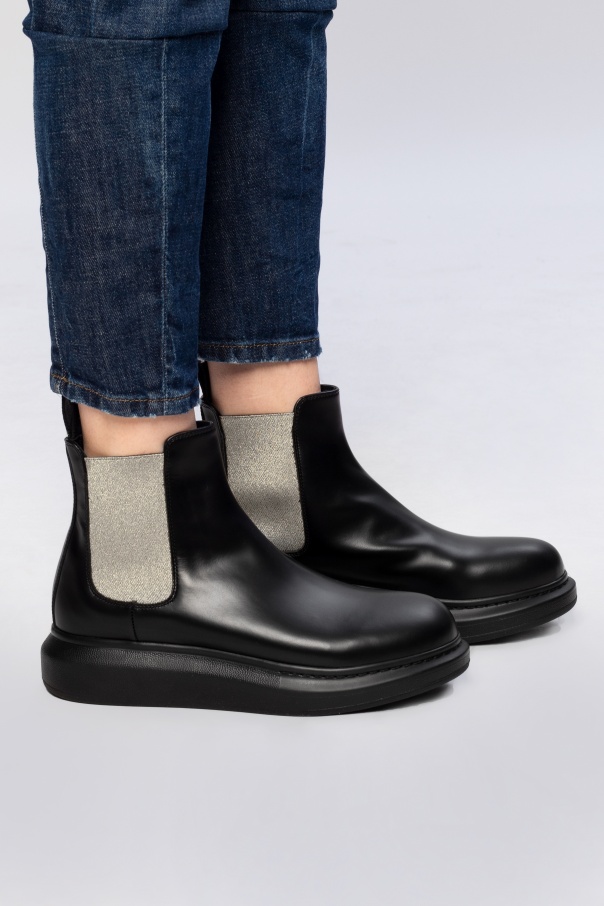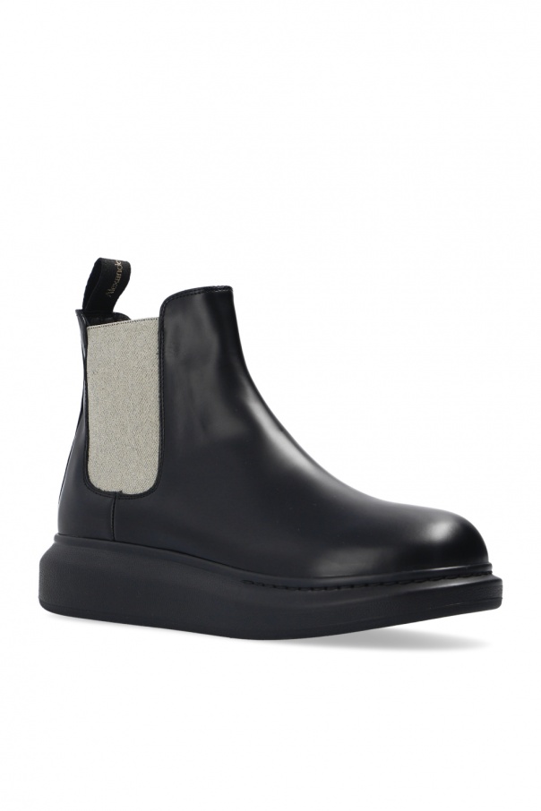 Black ankle boots from Alexander McQueen. Embroidered with the designer's logo in gold-tone on the heel, this leather-crafted pair has elastic inserts on the sides and a black rubber sole at the base.