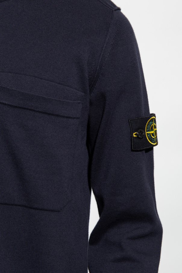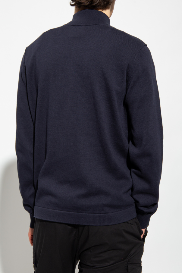 Navy cardigan with a high neck from Stone Island. Made of cotton, this garment features a two-way zip, front pocket, detachable sleeve patch with a logo and ribbed trims at the neck, hem and cuffs.