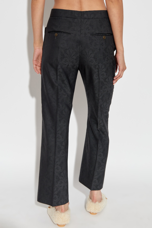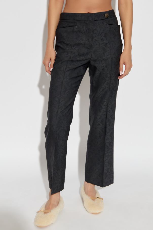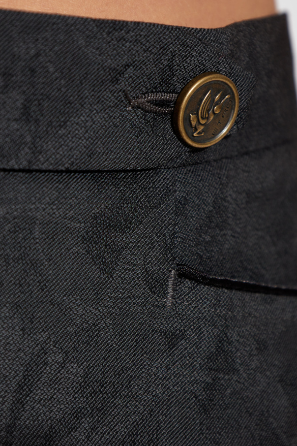 Introducing the Spodnie w kant z dekoracyjnym wzorem, a masterpiece from the prestigious house of Etro. These trousers, crafted from luxurious wool, exemplify the epitome of sophistication and refined elegance. The classic, straight-cut design with a pressed crease creates a timeless silhouette, while the gently tapered legs enhance the contemporary aesthetic. The subtle, decorative pattern adorning the fabric sets these trousers apart, adding an element of unique charm. The high-quality material ensures not only a superior look but also unparalleled comfort. The wide waistband, adorned with an ornamental button featuring the designer's logo, provides a seamless fit and a touch of distinguished flair. Thoughtfully designed pockets, both front and back, offer practicality, with the rear pockets secured by buttons for added security. Why choose this product? Exquisite craftsmanship from the renowned Etro brand. Elegantly tapered design with a classic pressed crease. Unique decorative pattern for a distinctive look. High-quality wool material for comfort and durability. Functional pockets with stylish button closures.