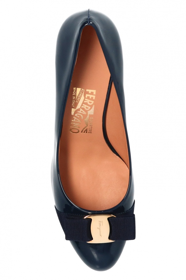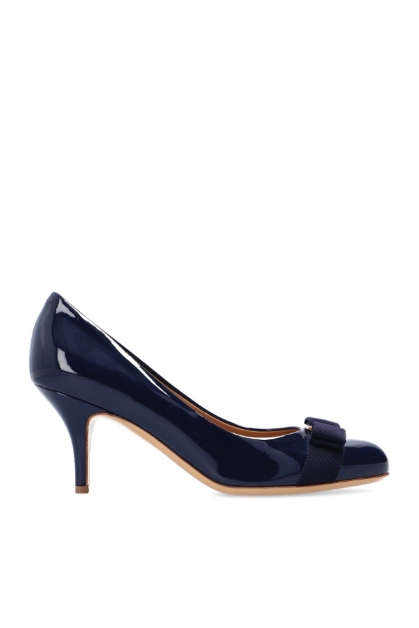 Navy blue ‘Carla’ pumps from Salvatore Ferragamo. Crafted from patent calf leather, this pair sits on a beige leather sole and boasts decorative grosgrain bow and logo-embossed plaque at the centre.