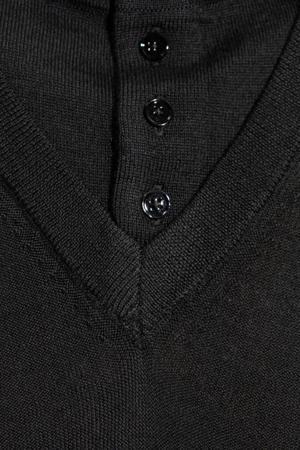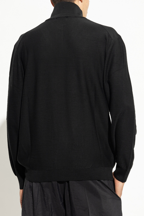 Black sweater from Lemaire. Crafted from a merino wool blend, this loose-fitting design features a buttoned stand collar and ribbed trims at the neck, hem and cuffs.