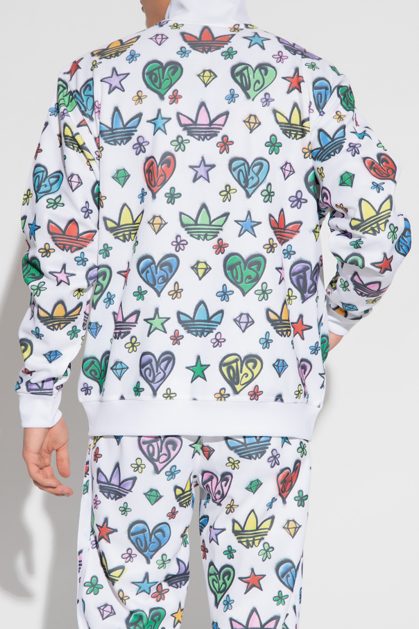 White sweatshirt with a stand collar from ADIDAS Originals x Jeremy Scott. Crafted from a blend of cotton and recycled fabric, this garment features a zip fastening, multicolored printed logo pattern, the brand's signature three stripes down the sleeves and ribbed edges.