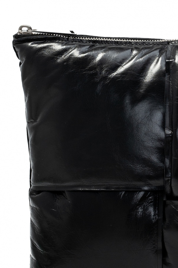 Black 'Pouch' clutch from Bottega Veneta. Crafted calf leather boasting the maxi padded 'Intrecciato' weave which is signature for the label, this design fastens via zip and showcases satin-like finish throughout. It features silver-tone metal hardware and interior with one compartment and one slip pocket.