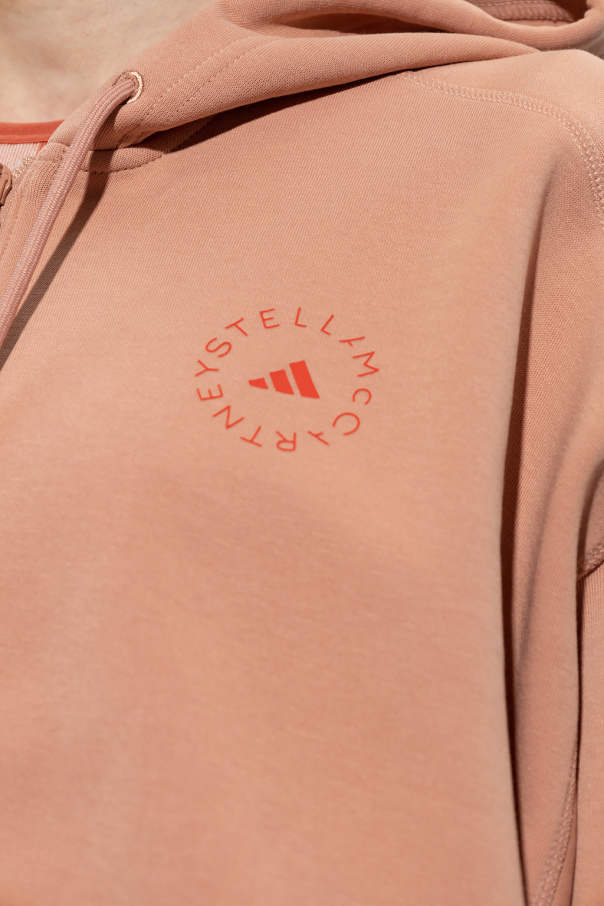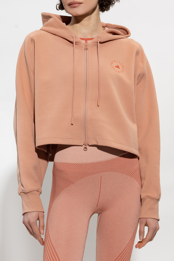 Pinkish beige cropped hoodie from ADIDAS by Stella McCartney. Made of a blend of organic cotton and recycled materials, this garment features two-way zip, red logo print, drawstring hood and ribbed trims at the hem and cuffs.