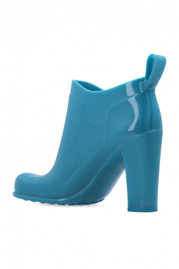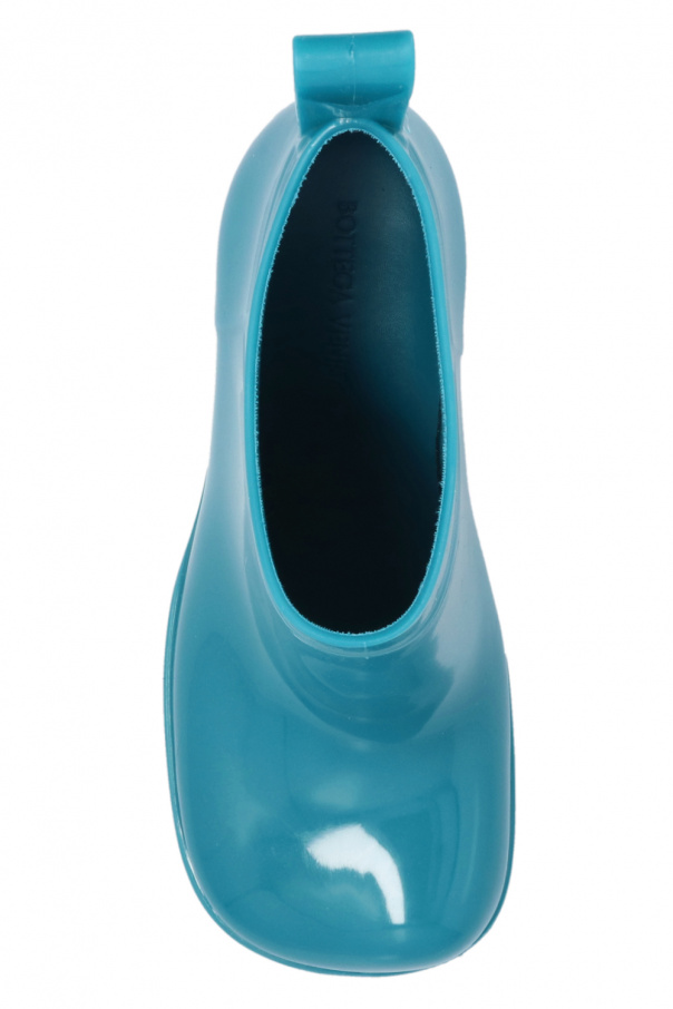 Blue ‘Shine’ rubber boots from Bottega Veneta. Resting on a blue rubber sole, this pair has a decorative toe.