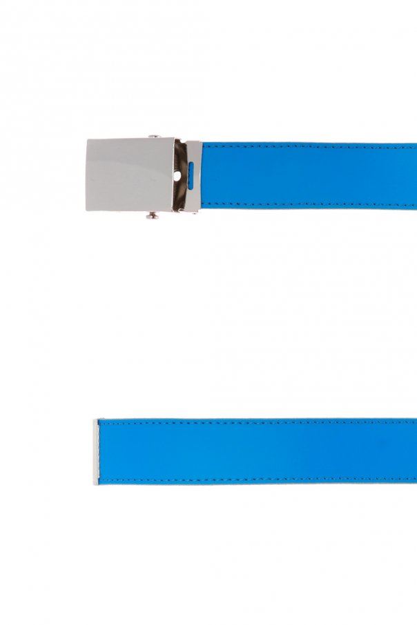 Blue and neon orange reversible belt from Comme des Garcons. Made of leather. Fastened with a silver-tone buckle.