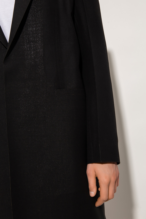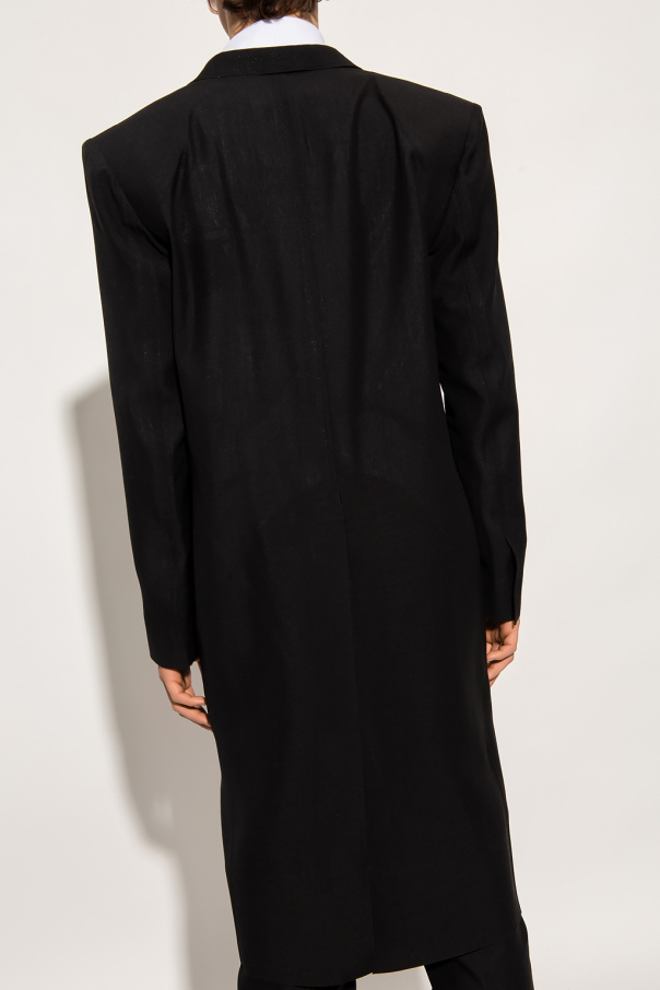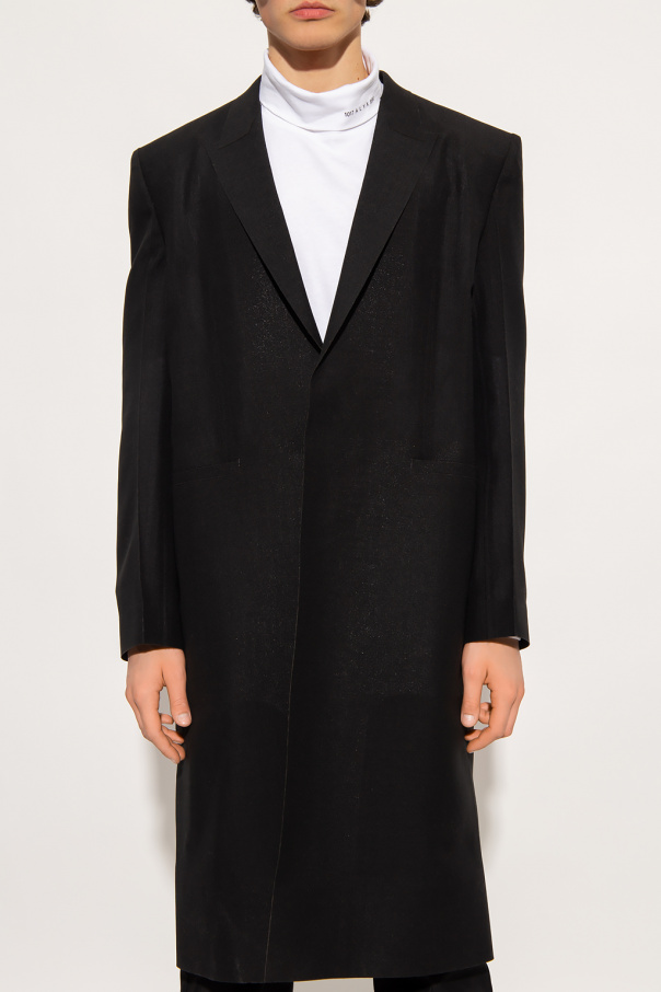 Black coat from Givenchy. Crafted from a rigid wool and mohair blend with a semi-sheer finish, this style features a single button closure, a collar with glued notch lapels, two slip pockets, a single back vent and long sleeves with hidden button closures.