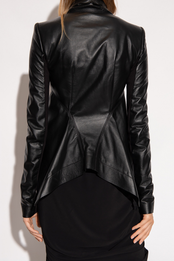 Black jacket with a stand collar from Rick Owens. Made of lamb leather, this garment features a concealed zip, decorative hem and long sleeves with ribbed cuffs.