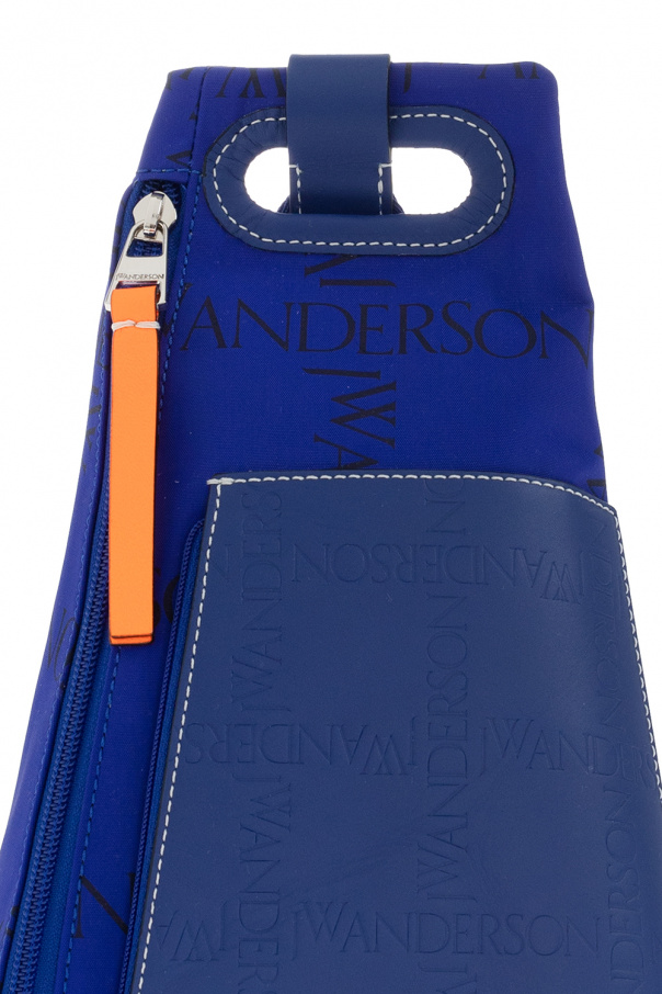 Dark blue belt bag from JW Anderson. Crafted from nylon and trimmed with leather, this design features a triangular shape, a zip fastening, a black logo pattern, an embossed leather patch on the front, zippers with orange pull tabs, an adjustable strap and one internal compartment.