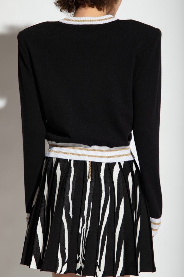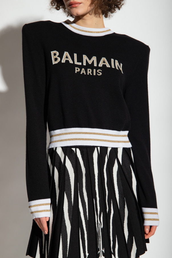 Black crewneck sweater from Balmain. Crafted from a fabric blend including lurex yarn, wool and cashmere, this style features an embroidered white and gold-tone logo on the front, padded shoulders, long sleeves and ribbed trims on the collar, bottom hem and cuffs.