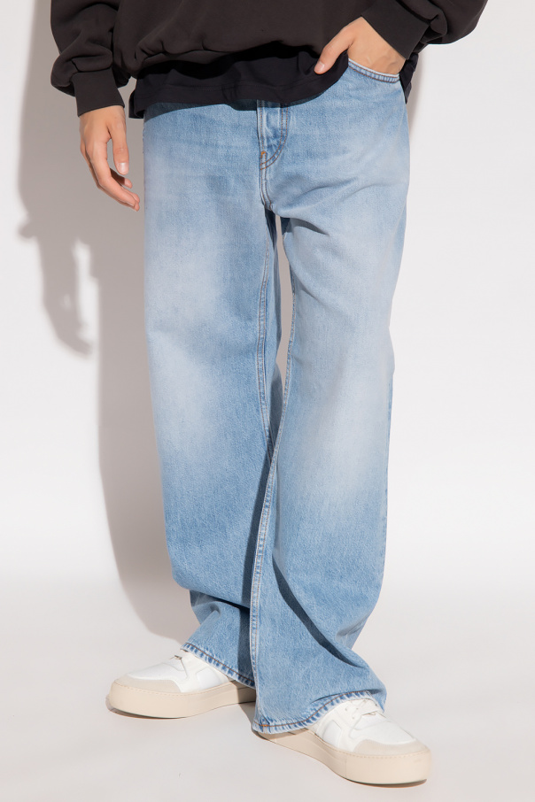Light blue ‘Acne Studios 2021M’ jeans from Acne Studios. Made from organic cotton with a loose bootcut fit, this pair features button fastenings, distressed details, classic five pockets and a logo-embossed patch at the back.
