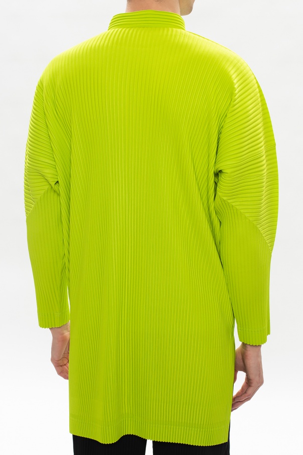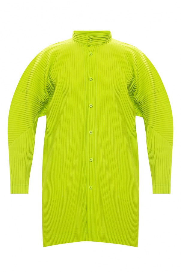 Green shirt from Issey Miyake Homme Plissé. Arrayed with the label's signature pleating, this style fastens via buttons and employs a standing collar, long sleeves, two frontal pockets, side slits and an elongated back hem.