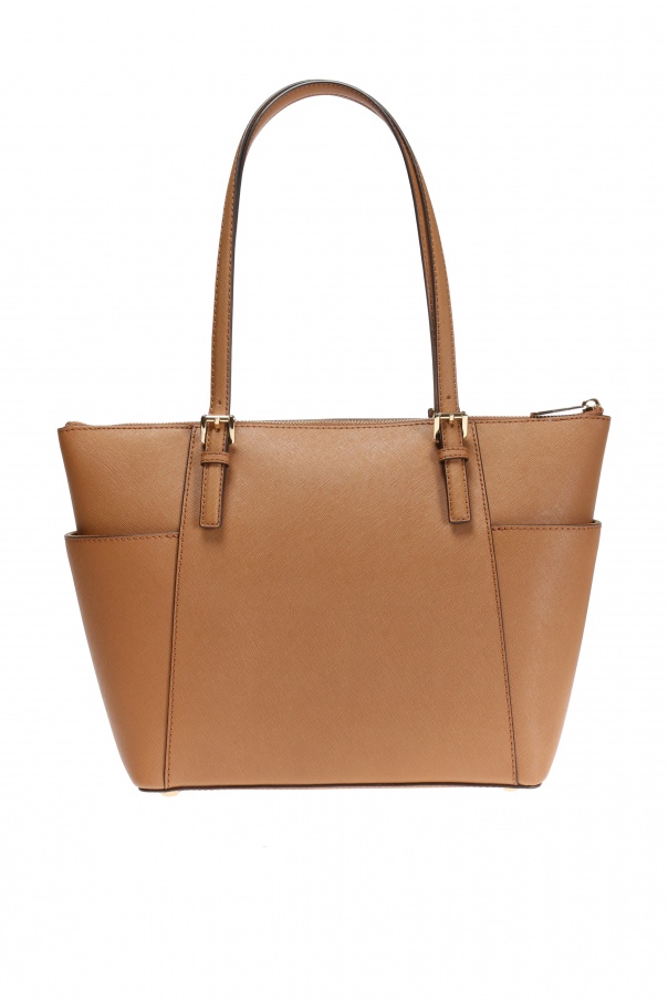 Brown 'Jet Set Item' shoulder bag from Michael Michael Kors. Made of Saffiano leather. Fastened with zip. Gold-tone metal logo at front. 2 side slip pockets. 2 adjustable shoulder straps. Beige, lined interior with 1 zip pocket and 3 slip pockets. Gold-tone metal hardware. Attached key ring with metal logo.
