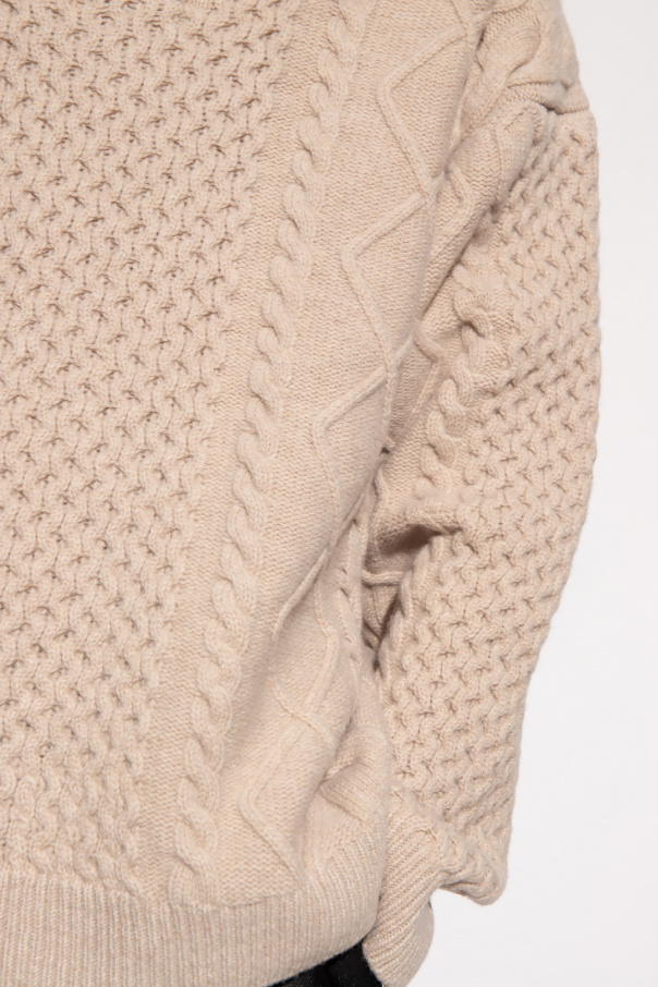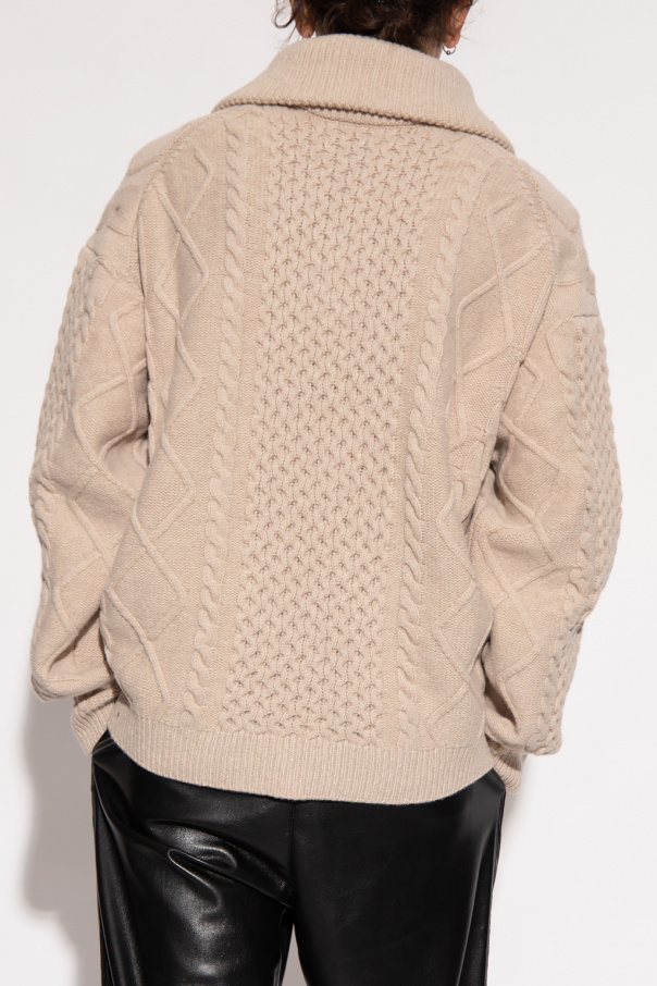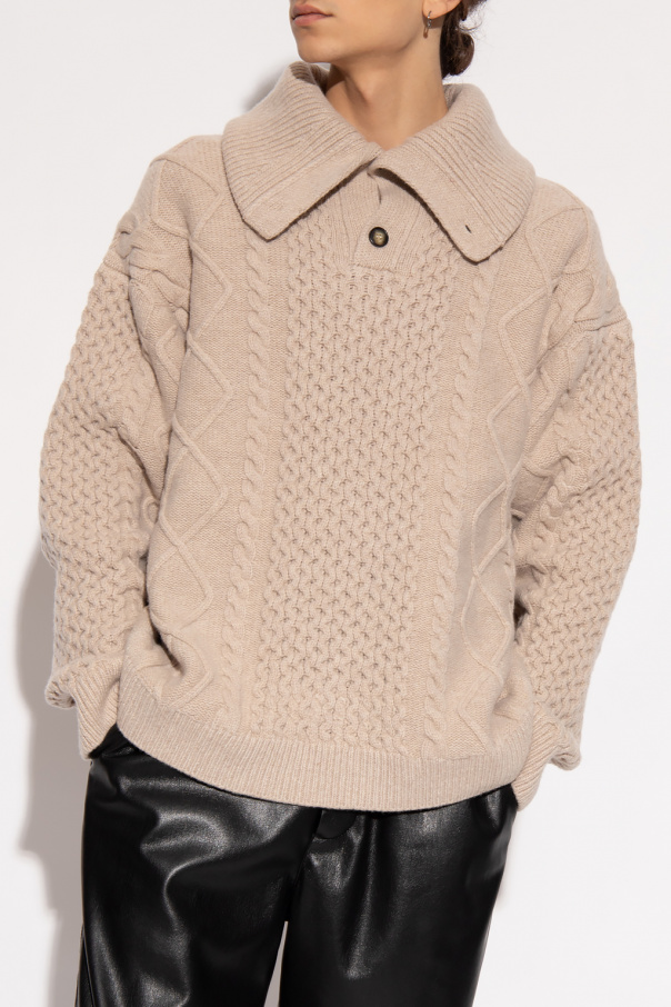 Light beige ‘Batu’ loose-fitting sweater from Nanushka. Made of a merino wool and cashmere blend, this garment features a funnel neck with buttons, decorative knit details and ribbed edges.