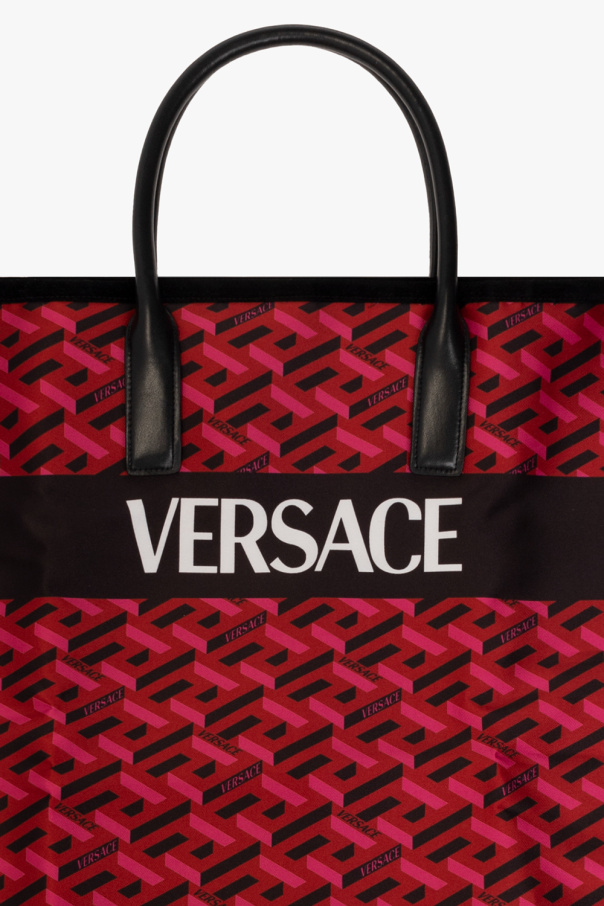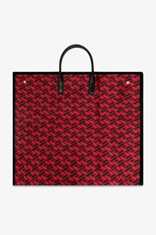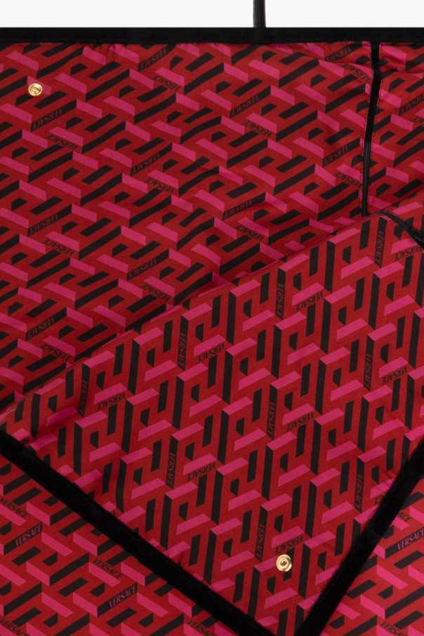 Red, black and pink travel clothes hanger from Versace Home. Crafted with a waterproof and anti-stain finish, this item showcases the brand's ‘La Greca’ motif, a zip fastening, a white logo print, two half-round handles and velvet edges.