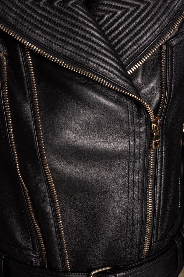 Black biker jacket from Balmain. Made of leather, this model features a zip fastening, adjustable buckle strap, two front zip pockets, padded shoulders, long sleeves and gold-tone metal hardware.