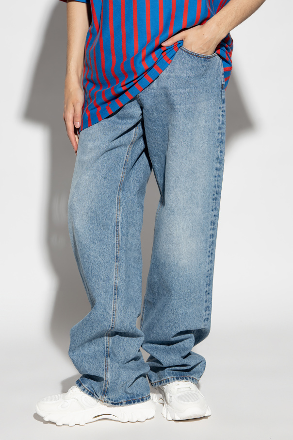 Blue loose-fitting jeans from Balmain. Crafted with a vintage effect, this pair falls with wide legs and features a back logo patch, button fastenings and classic five pockets.