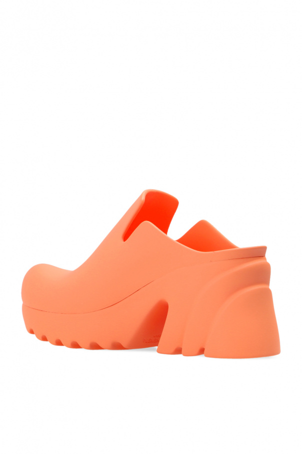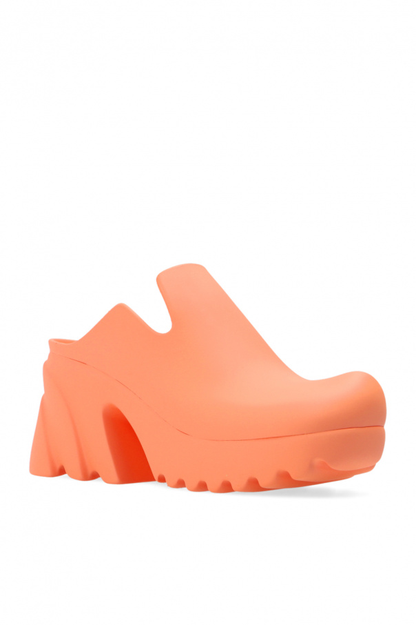 Pink ‘Rubber Flash’ heeled mules from Bottega Veneta. Made of rubber, this pair rests on a pink rubber sole.