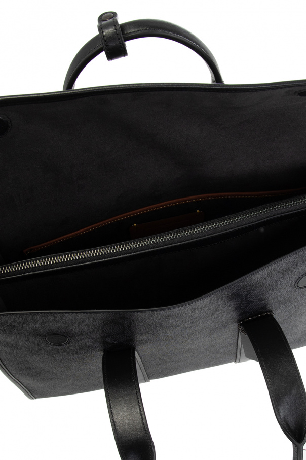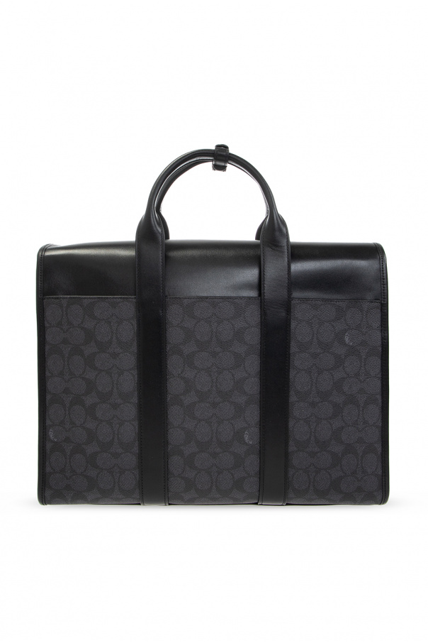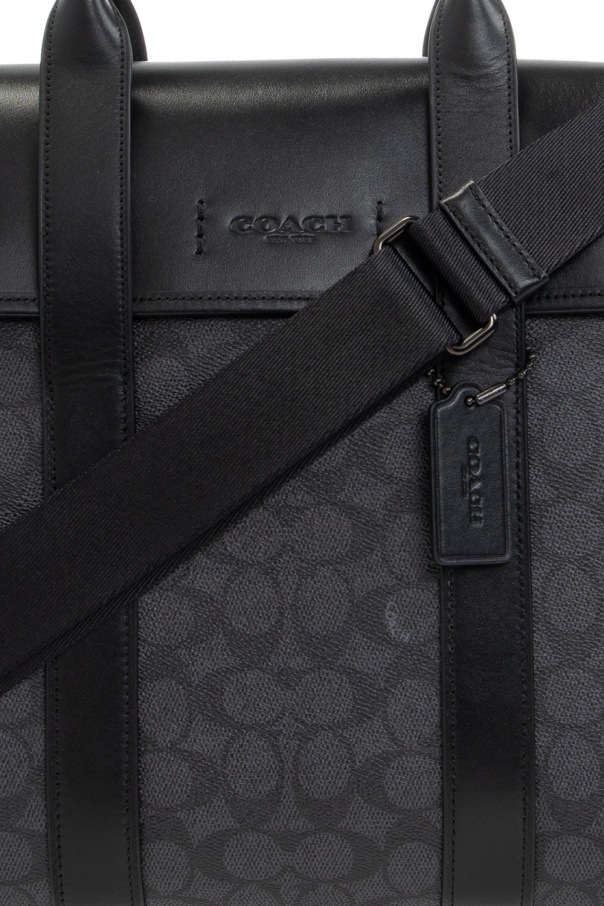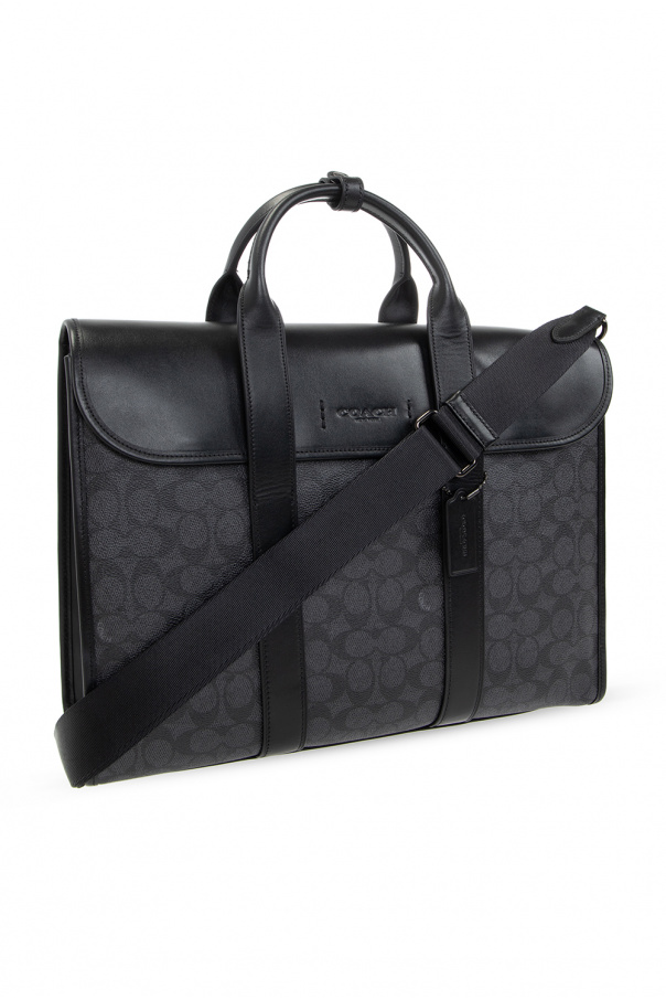 Black and navy blue ‘Gotham’ briefcase from Coach. Crafted from monogrammed canvas with leather trims, this design secures with magnetic closures and showcases an embossed logo on the front, a slip pocket on the back, two half-round handles, a detachable and adjustable shoulder strap and an interior with three separate compartments (one is zipped) and two slip pockets.