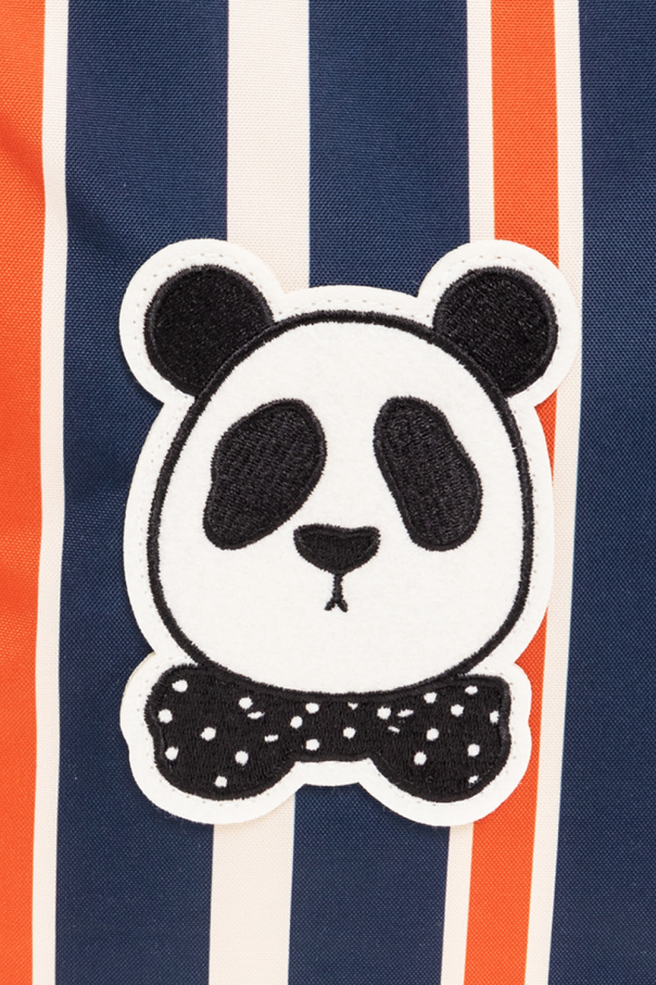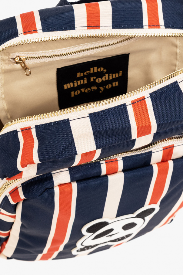 Beige, navy an orange backpack from Mini Rodini. Crafted from recycled materials, this model features a zip fastening, animal patch, stripe pattern, front zip pocket, half-round handle and adjustable shoulder straps.