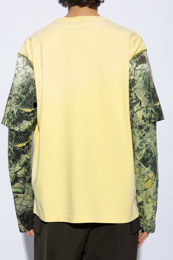 Introducing the Diesel T-WESHER-N5, a long-sleeved T-shirt that exemplifies simplicity with a twist of modernity. Crafted from a soft, lightweight cotton blend, this piece offers unparalleled comfort and breathability. Its vibrant yellow hue serves as a canvas for the distinctive military camouflage pattern adorning the sleeves, creating a striking contrast in earthy green and brown tones. The classic silhouette, characterized by a rounded neckline and a casual fit, ensures versatility and ease of wear. Embellished with a subtle, embroidered Diesel logo on the chest and a bold red patch featuring the iconic "DIESEL" insignia and the motto "FOR SUCCESSFUL LIVING" at the back, this T-shirt stands out as a testament to the brand's commitment to quality and unique style. The fabric's slightly textured weave adds an extra layer of depth and sophistication, making the T-WESHER-N5 not just a garment, but a statement piece. Its design harmoniously blends the essence of streetwear with the elegance of high fashion, making it a must-have for those who dare to express themselves unapologetically. Why Purchase This Product? Exquisite Craftsmanship: Meticulously designed by Diesel, a leader in fashion innovation. Unique Design: The military camouflage sleeves and distinctive brand markings elevate this T-shirt above the ordinary. Superior Comfort: Made with a soft, breathable cotton blend, ensuring comfort throughout the day. Versatile Style: Perfect for casual outings or layering under jackets for a more composed look. Authenticity: Embroidered logo and branded patch serve as hallmarks of genuine Diesel craftsmanship.