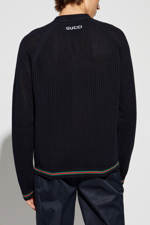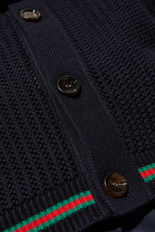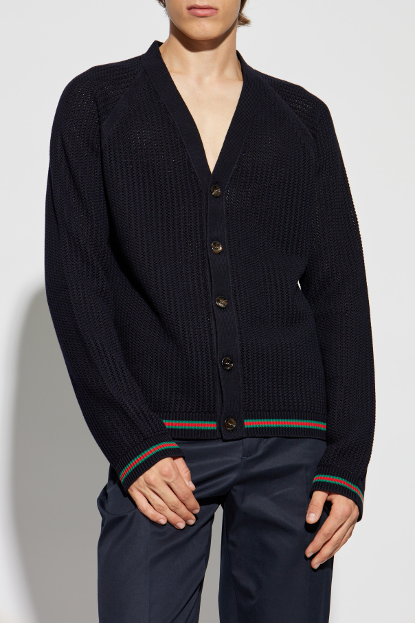 Introducing the Navy Logo Cardigan from the exclusive collection by renowned designer Gucci. This exquisite piece showcases the impeccable craftsmanship and innovative design for which the brand is celebrated. Crafted from fine knit material with a structural weave, the cardigan boasts a classic button-up design with a sophisticated V-neckline. The dominant navy hue is elegantly contrasted by distinctive green and red stripes on the cuffs and hem, adding a touch of refined flair. The back features a prominent white "GUCCI" logo, an emblem of luxury and style. The cardigan fastens with five buttons, providing both ease of wear and a polished appearance. Inside, the collar is adorned with a designer label, a testament to its authenticity. Why Choose This Product? Premium knit material ensures comfort and durability. Classic design with modern, stylish accents. Signature "GUCCI" logo for a statement look. Versatile for both formal and casual occasions. Expertly crafted by Gucci, a symbol of luxury and elegance.
