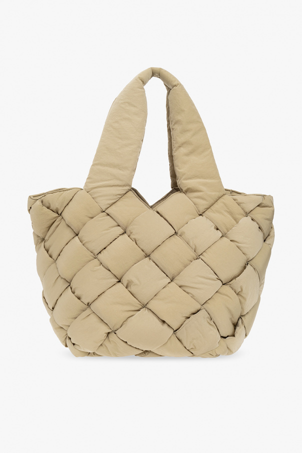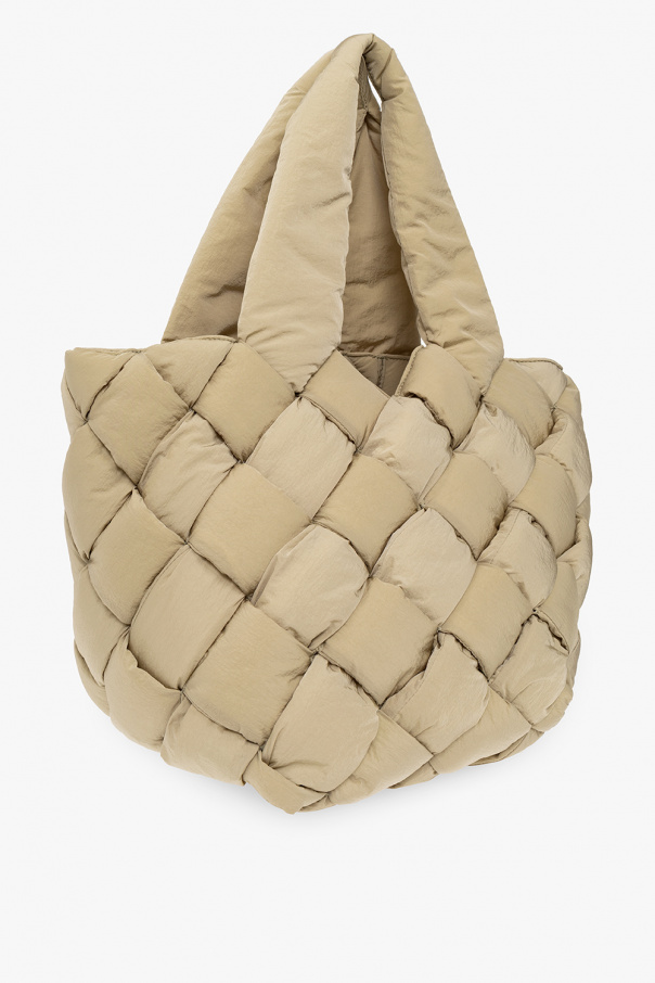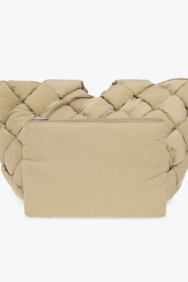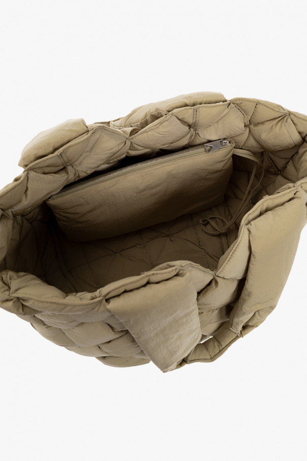 Greenish grey ‘Cassette Small’ shopper bag from Bottega Veneta. Crafted from padded tech nylon, this design showcases the brand's signature Intreccio weave. It is complete with an adjustable strap, two half-round handles, silver-tone metal hardware and one internal compartment with a strapped zip pouch.
