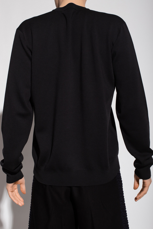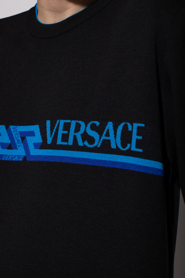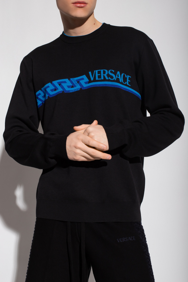 Black sweater from Versace. Crafted from wool, this garment features a blue and navy logo pattern and ribbed trims at the neck, hem and cuffs.