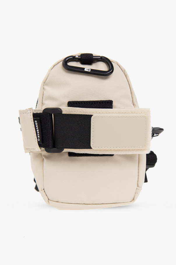 Cream shoulder bag from Converse x Rick Owens DRKSHDW. Fastened with a zip, this garment features a black logo print, detachable carabiner hook, front zip pocket, velcro at the back, adjustable shoulder strap, black metal hardware and one internal compartment with one slip pocket.