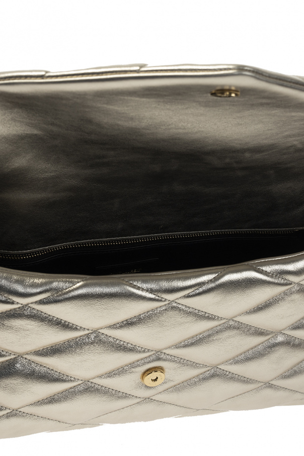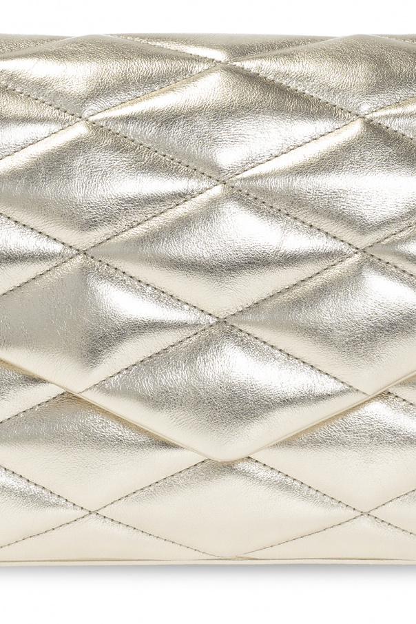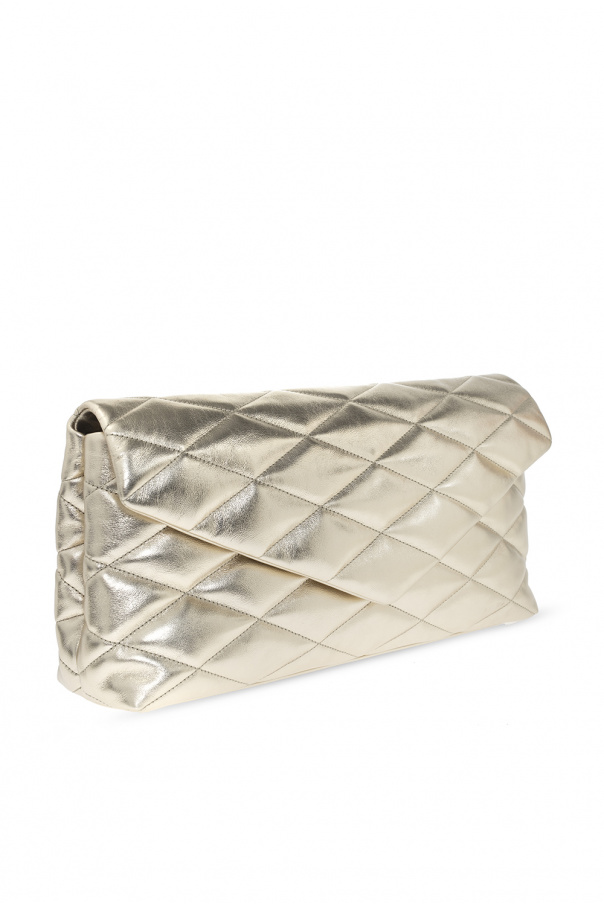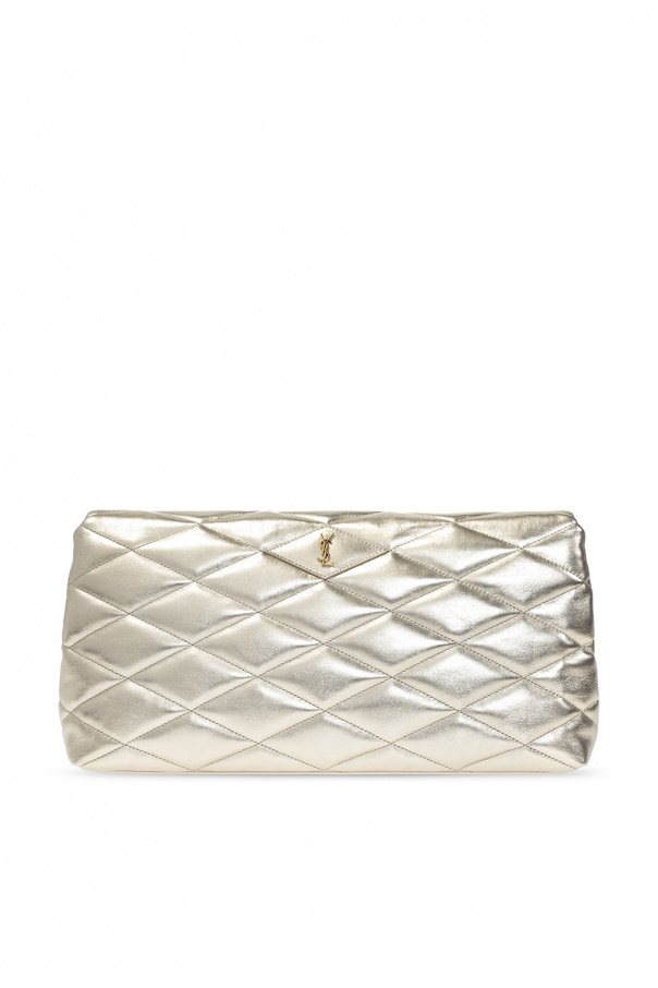 Gold-tone ‘Sade’ clutch from Saint Laurent. Crafted from calf leather, this design secures with a magnetic snap and showcases metal YSL initials on the back, gold-tone metal hardware and an interior with a zipped pocket.