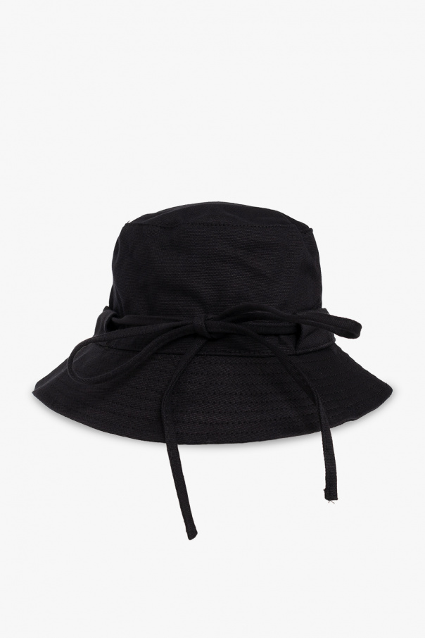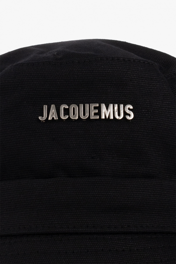 Black ‘Gadjo’ bucket hat from Jacquemus. Crafted from cotton, this item features a silver-tone metal logo plaque on the front and a drawstring fastening at the back.