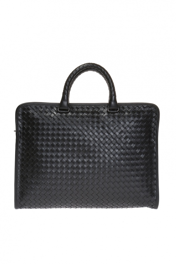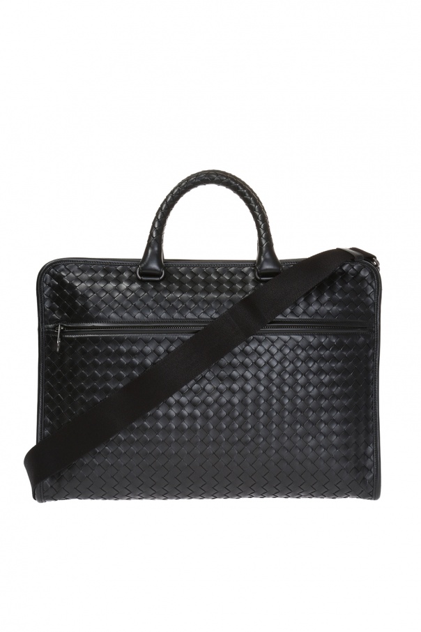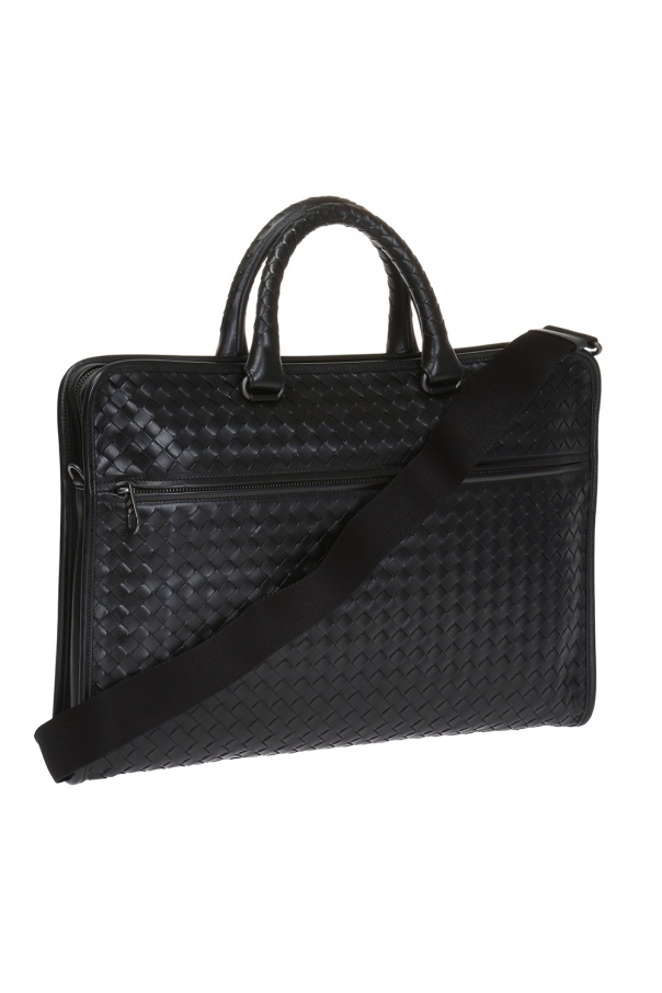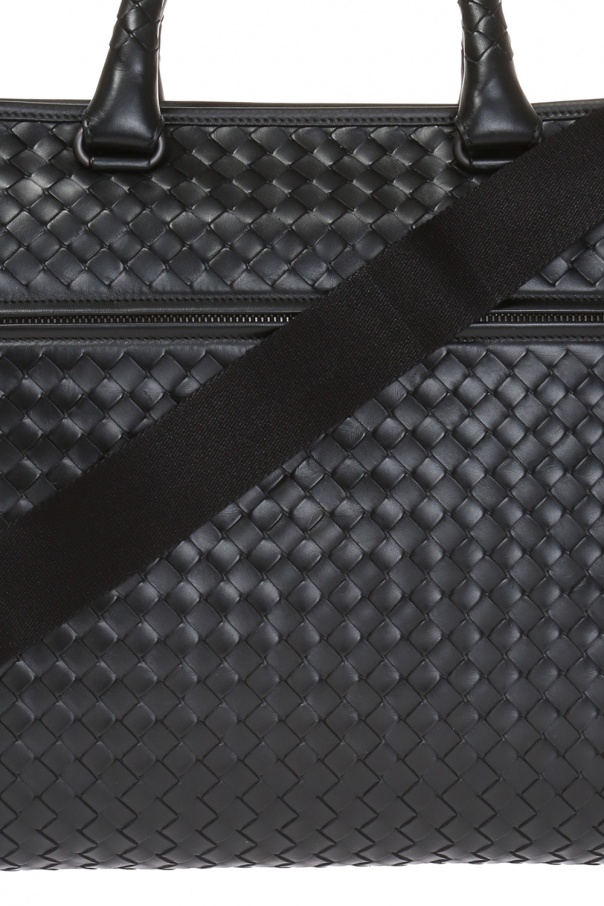 Black briefcase from Bottega Veneta. Made of calf leather. Fastened with a two-way zip. Decorated with the brand’s signature ‘Intrecciato’ weave. Zip pocket on the front. Two half-round handles. Detachable, adjustable shoulder strap. Cotton lining. Main internal compartment with two slip pockets. Dark grey metal hardware.