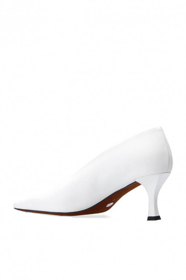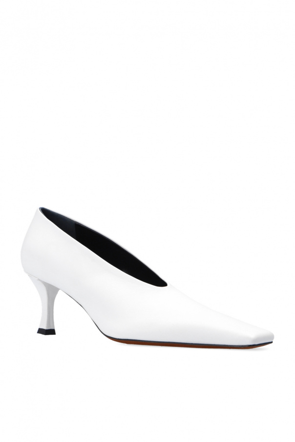 White ‘Trap’ pumps from Proenza Schouler. Crafted from lamb leather with an elongated toe, this model sits on a brown calf leather sole.
