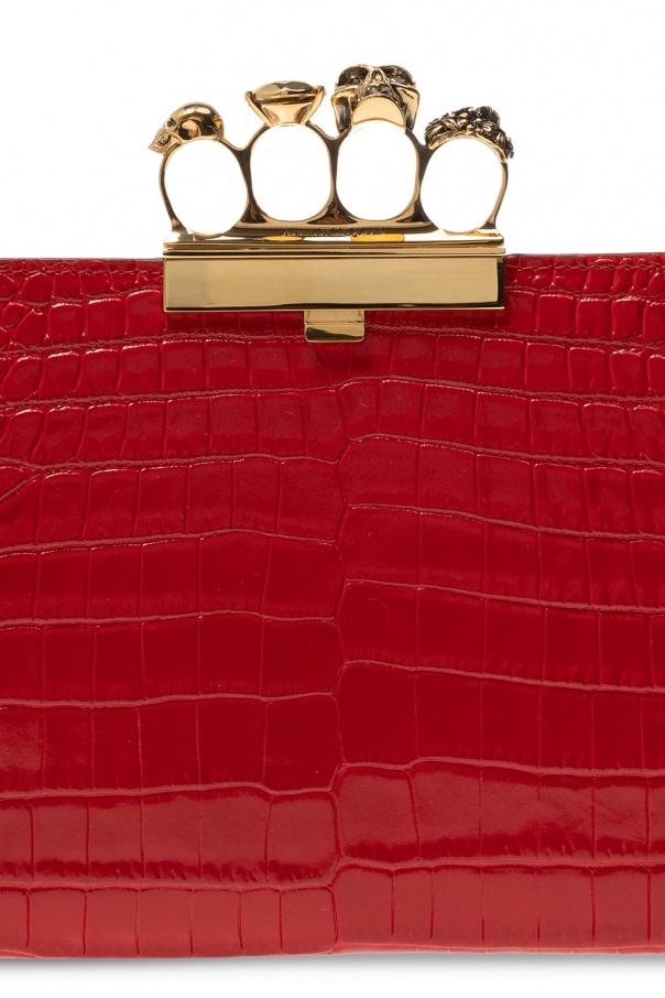 Red 'Four-Ring' clutch from Alexander McQueen. Crafted from calf leather with a crocodile skin effect, this extravagant design is defined by its decorative handle consisting of four rings with the iconic skull embellished with Swarovski crystals in gold-tone. It also features snap fastening, gold-tone brass hardware, beige suede lining and two internal zip pockets.