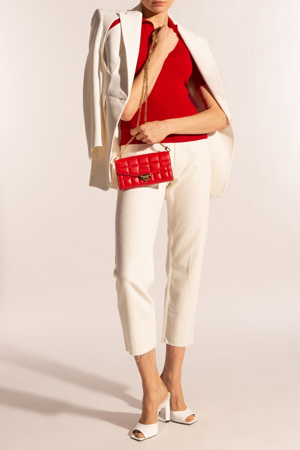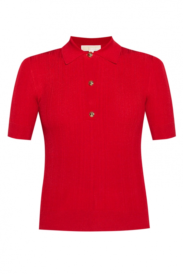 Red ribbed top from Michael Michael Kors. This short sleeve design fastens with decorative buttons enriched by a logo pattern in gold-tone.