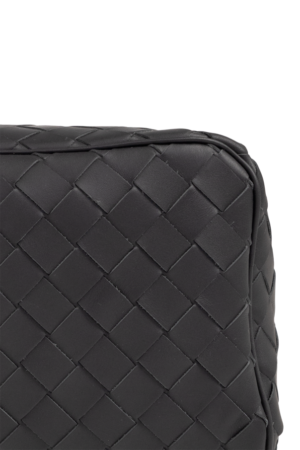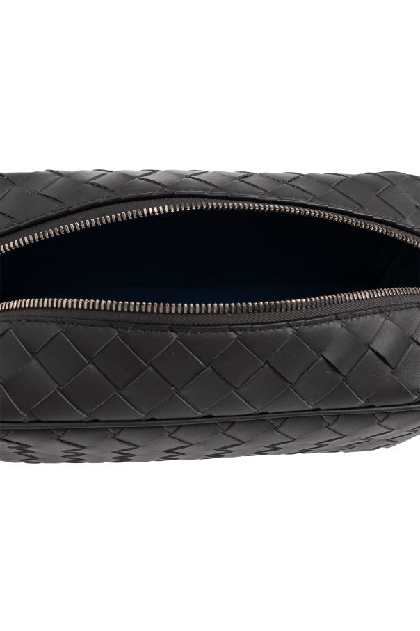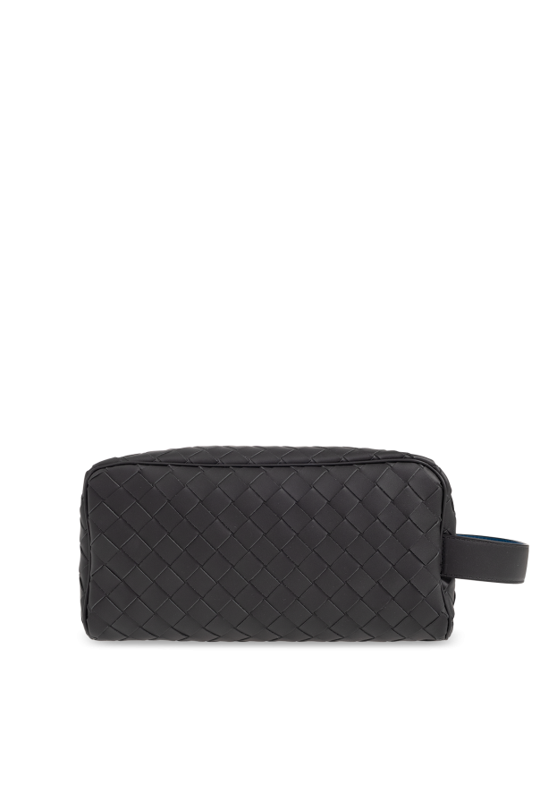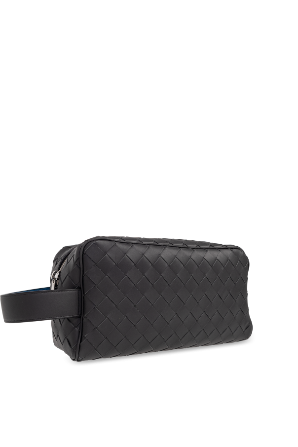 Grey ‘Intrecciato’ wash bag from Bottega Veneta. Made of Intrecciato calf leather, this design features a zip fastening, half-round handle and one internal compartment with one slip pocket and two zip pockets.