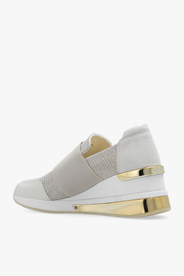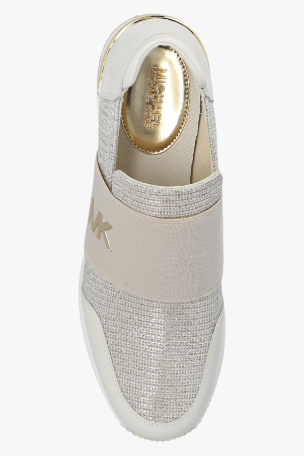 Cream ‘Felix’ wedge shoes from Michael Michael Kors. Crafted from leather, suede and glossy mesh inlaid with lurex yarn, this model sits on a white and cream rubber sole and features a wide band accentuated with a monogram application on the front and a gold-tone logo emblem at the back.