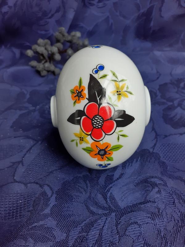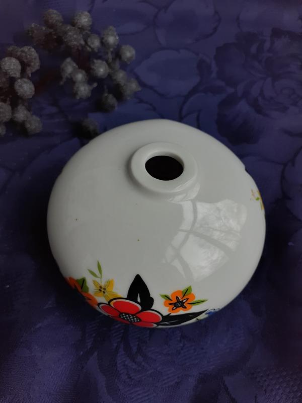 Выполнен из белоснежного фарфора в виде вазочки-шара. Украшен ручной надглазурной росписью. Орнаментальный рисунок нанесен вкруговую.