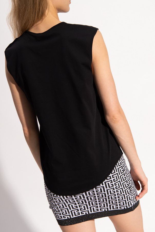 Black sleeveless top from Balmain. Made of cotton, this design features a velvet logo in white and a decorative metal applique in gold-tone.