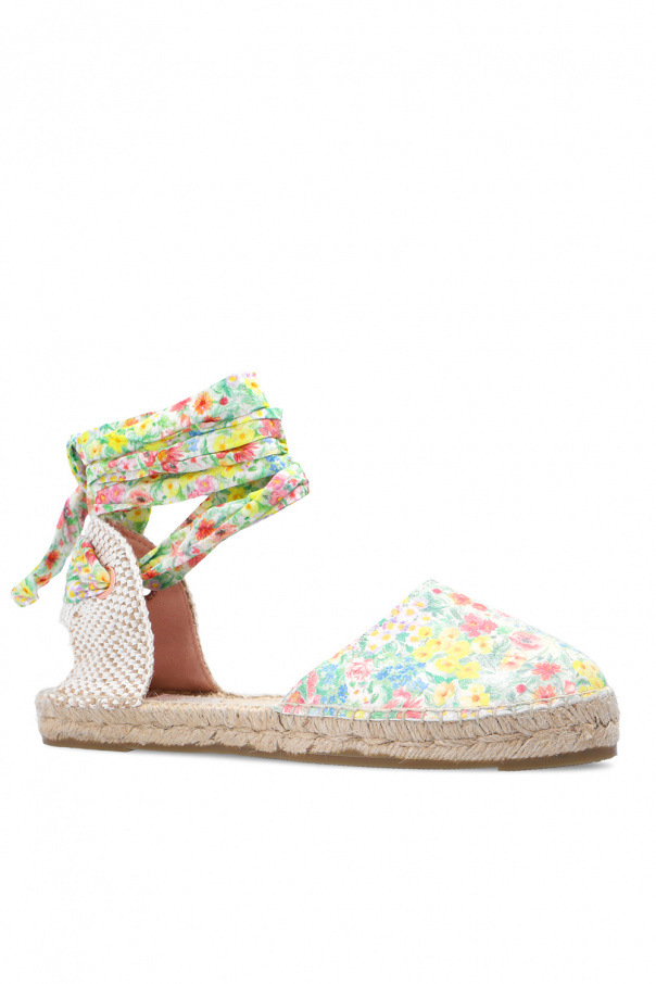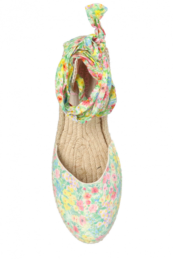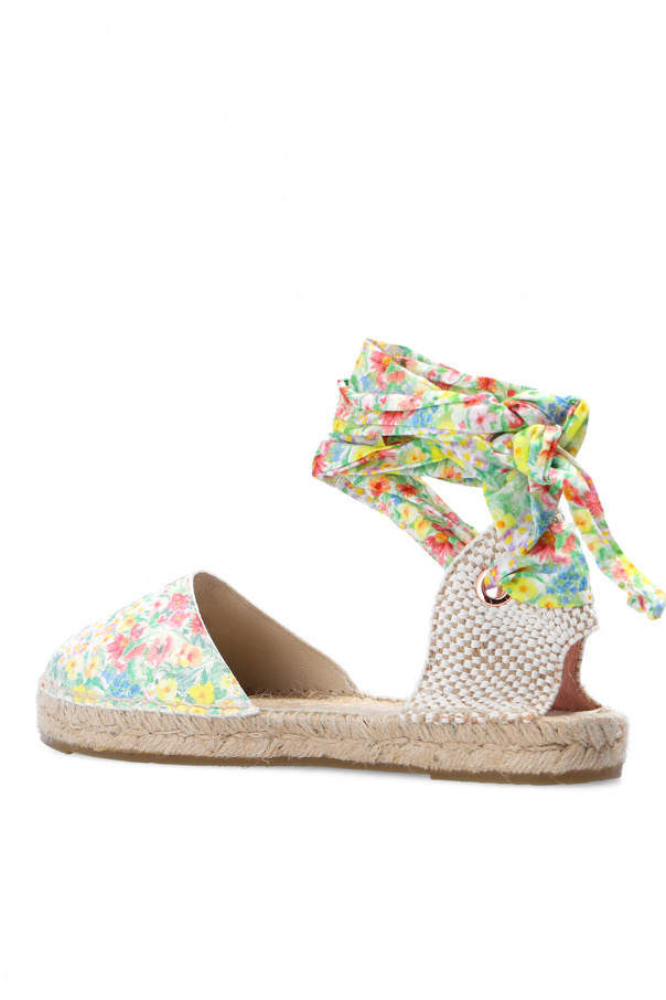 Multicoloured sandals from Manebi x LoveShackFancy, the ‘LoveShackFancy Loves Manebí’ collection. Crafted from suede, this model showcases a floral pattern, an open heel and a self-tie fastening at the ankle. The sole was made of natural jute trimmed with a thin layer of grey caoutchouc.
