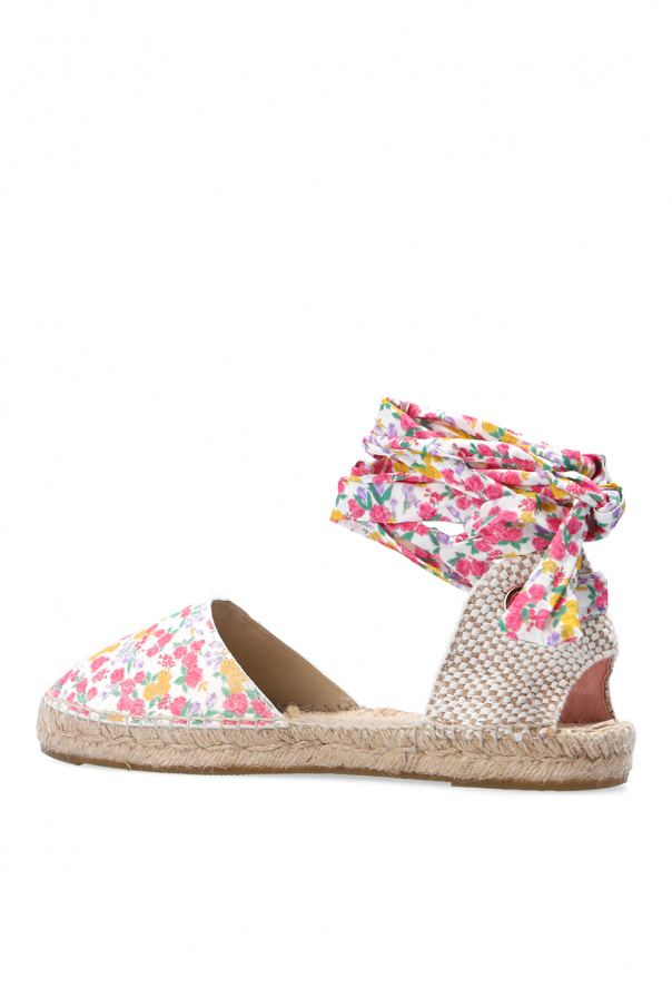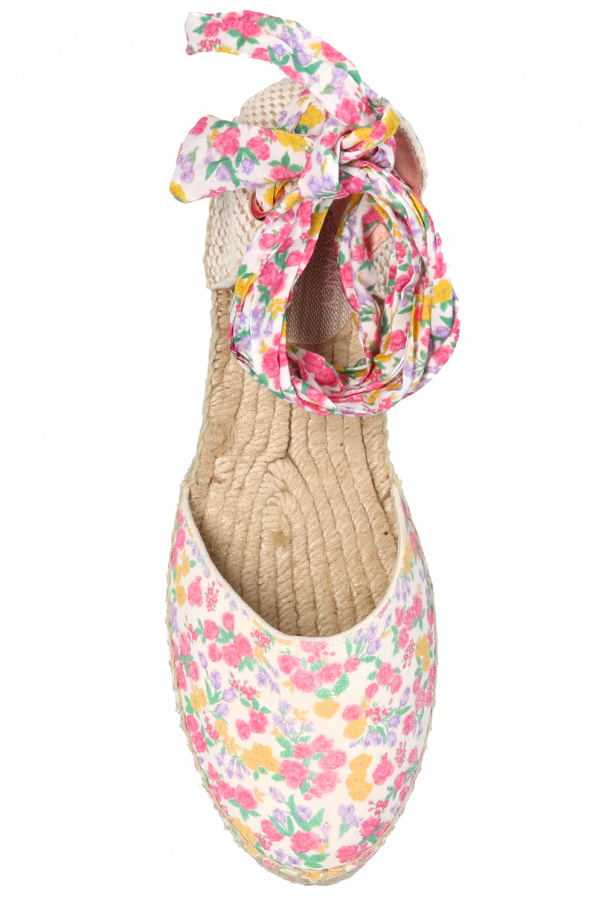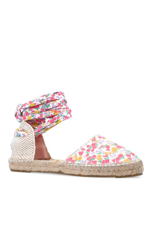 Cream and beige sandals from Manebi x LoveShackFancy, the ‘LoveShackFancy Loves Manebí’ collection. Crafted from suede, this model showcases a colourful floral pattern, an open heel and a self-tie fastening at the ankle. The sole was made of natural jute trimmed with a thin layer of grey caoutchouc.