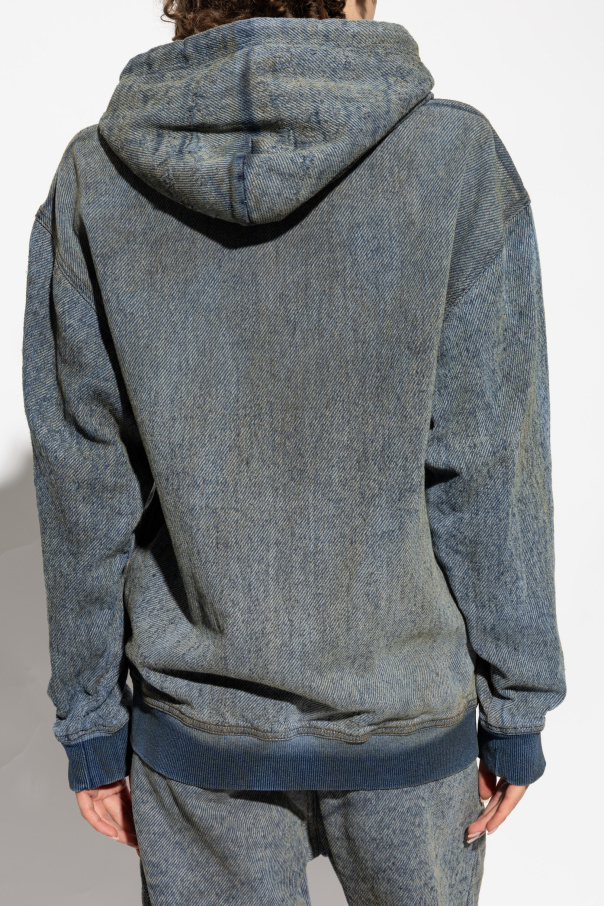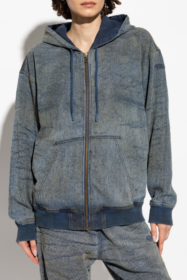 Introducing the Hoodie D-HARI-FSF from Diesel's exclusive collection, an epitome of casual elegance and comfort. Crafted with a classic, straightforward design, this hoodie features long sleeves and a full-length zipper at the front, making it a versatile addition to any wardrobe. The material boasts a denim-like texture, offering the aesthetic of jeans with the softness and comfort of a hoodie. This unisex garment is predominantly blue, showcasing various shades to create a distinctive denim effect, ideal for daily wear and casual ensembles. Notable for its attention to detail, the hoodie includes adjustable drawstrings on the hood and two kangaroo pockets at the front. The cuffs and hem are finished with ribbed trims in a darker, contrasting hue, adding a touch of sophistication. The subtle, embossed designer logo on the left sleeve completes the look, blending seamlessly with the garment's color scheme. Why Buy This Product? Exclusive design from the renowned brand, Diesel Denim-like appearance with the comfort of a hoodie Versatile and unisex, suitable for all genders High-quality material composition: 85% Cotton, 12% Polyester, 3% Elastane Unique and subtle designer logo detail