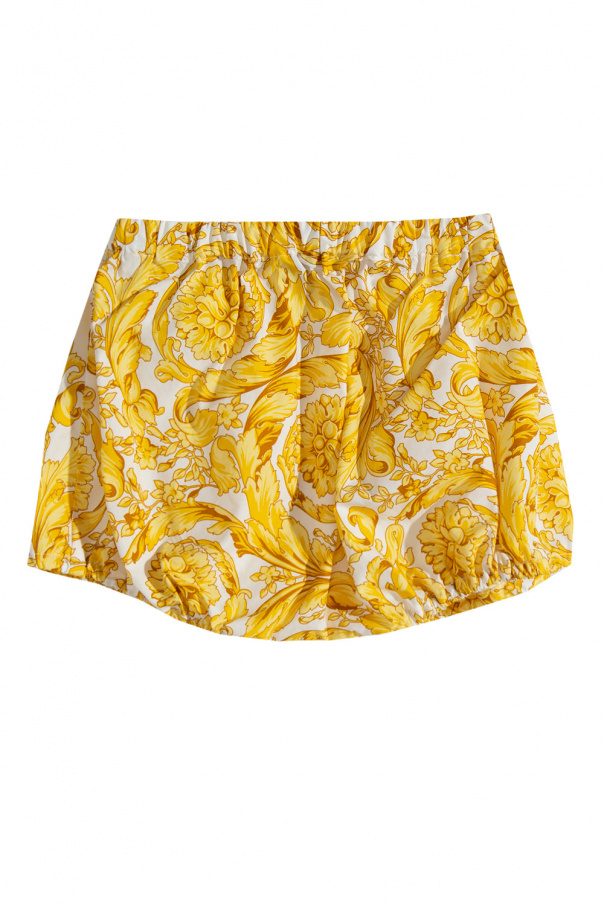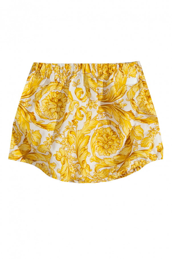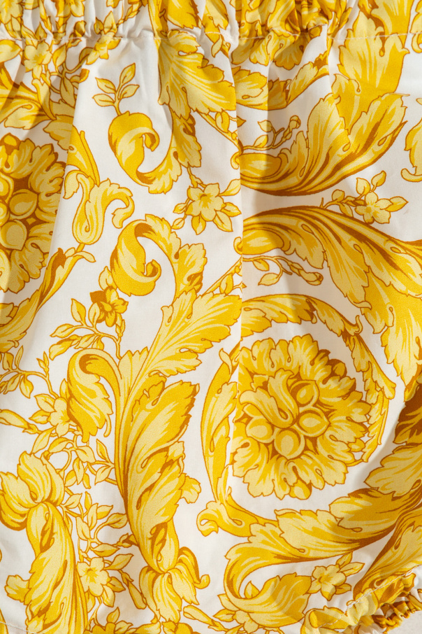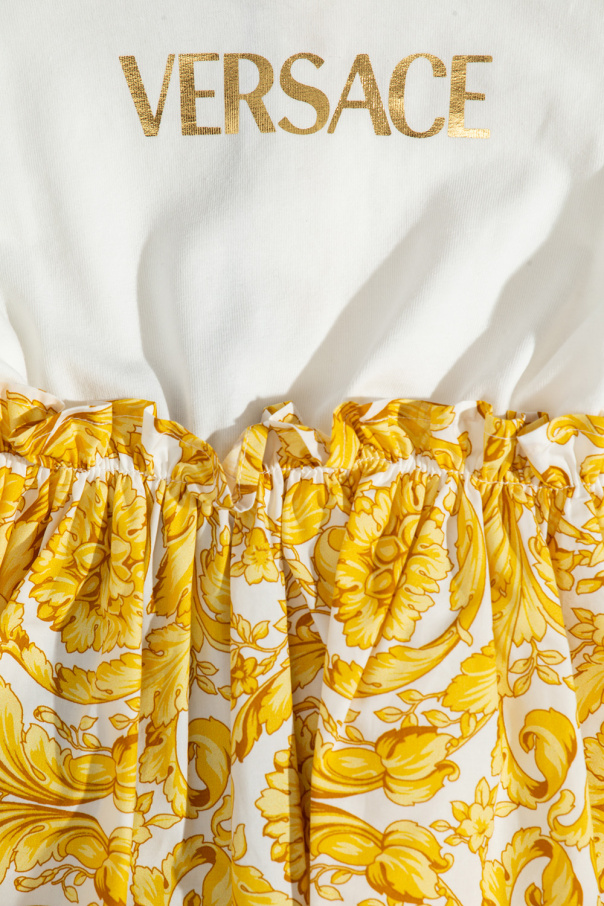 White Versace Kid dress. Made of cotton. Printed gold-tone logo on the front. The bottom is decorated with a characteristic baroque pattern in yellow and brown. Briefs attached.