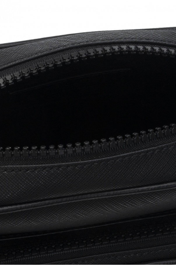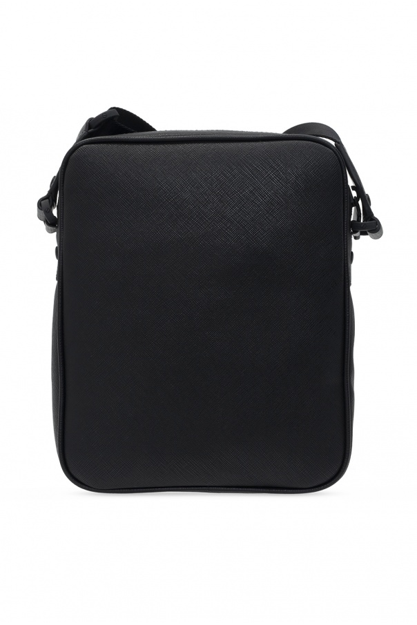 Black ‘Sebert’ shoulder bag from Bally. Crafted from faux saffiano leather, this design fastens with a zip and is decorated with printed white and red stripe and a rubber logo patch. It is complete with an adjustable shoulder strap and one internal compartment with one zip pocket and one slip pocket.