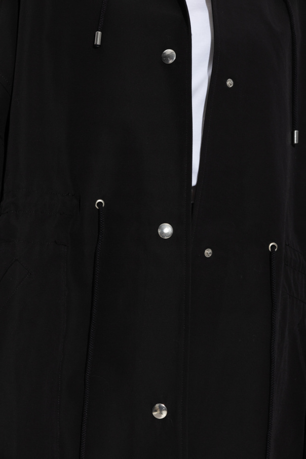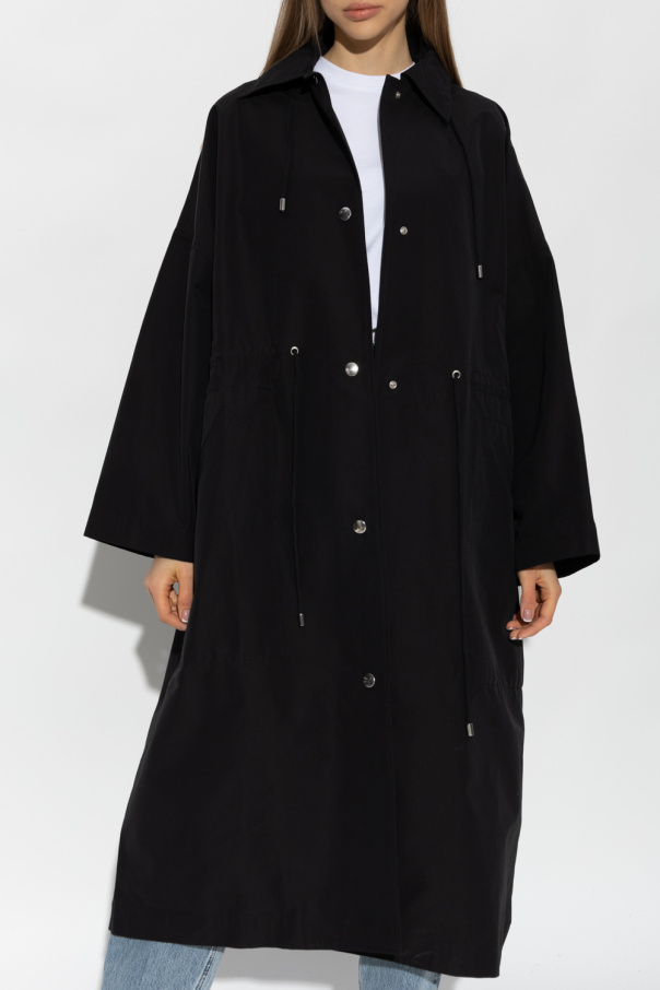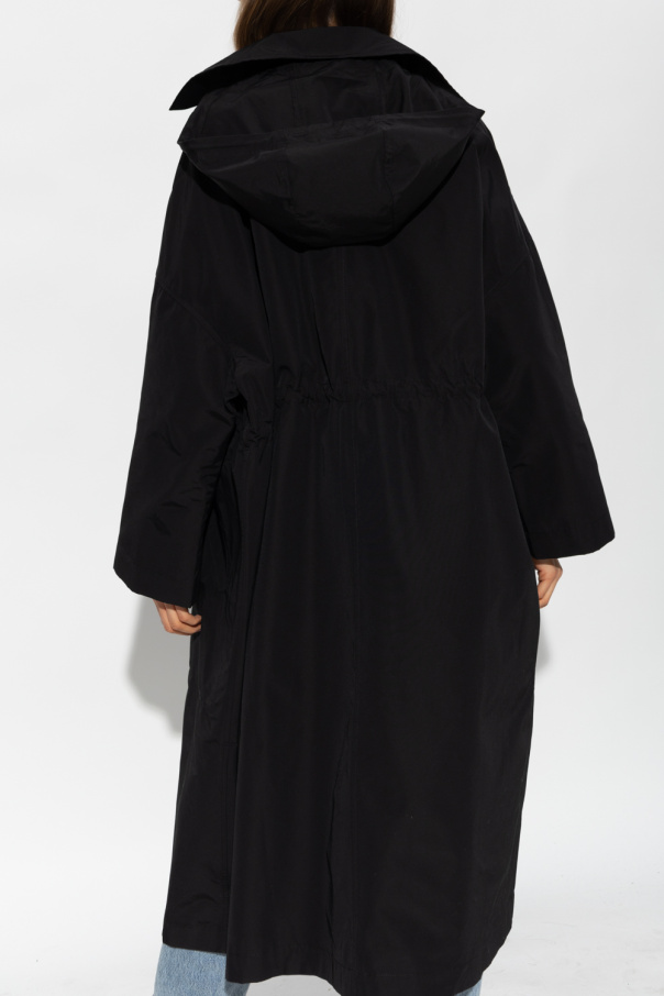 Black coat from Toteme. Crafted from a blend of water-resistant organic cotton and recycled polyamide, this style features an oversize fit, a drawcord-adjustable hood and waist, snap closures, two slip pockets and long sleeves.
