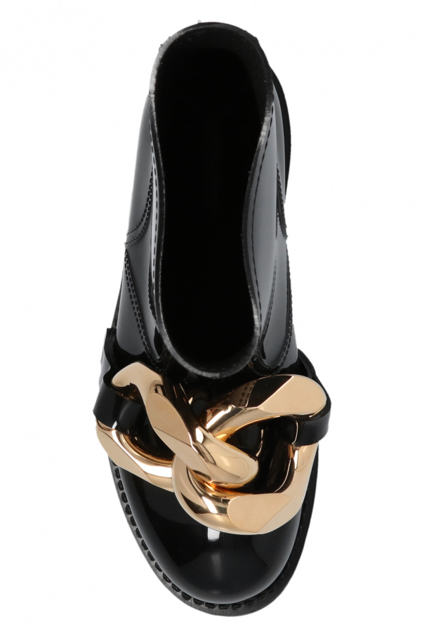 Short, black rain boots from JW Anderson. Decorated with a metal chain link appliqué in gold-tone, this pair rests on a black rubber sole.