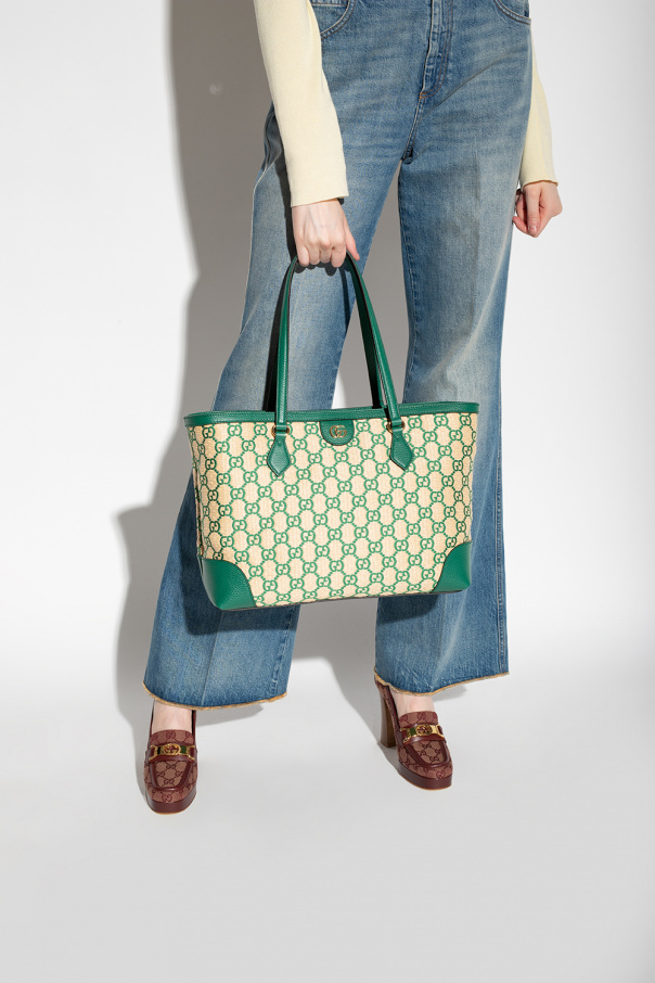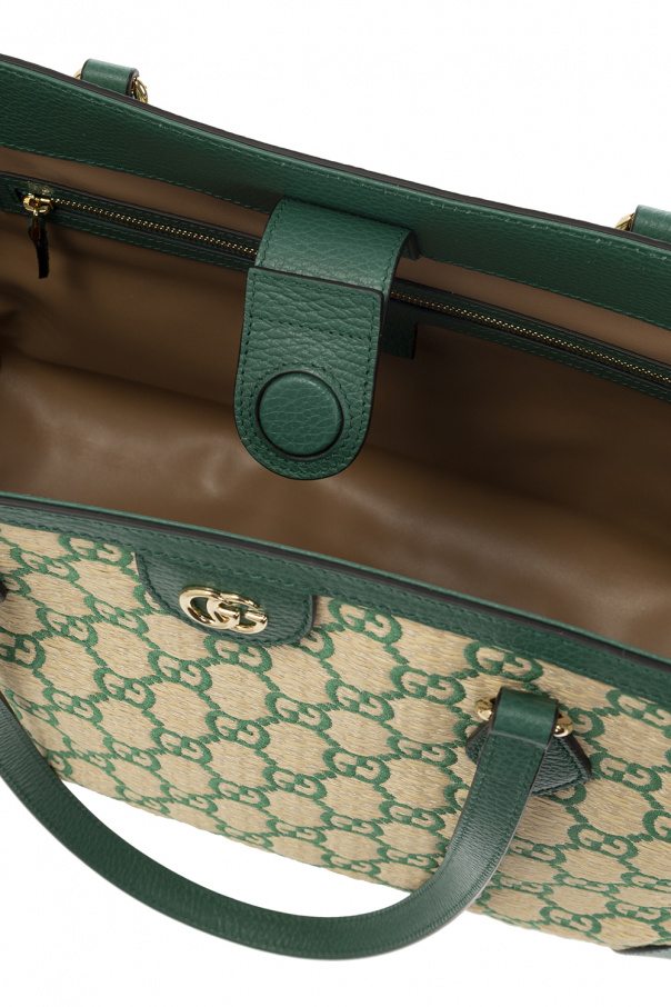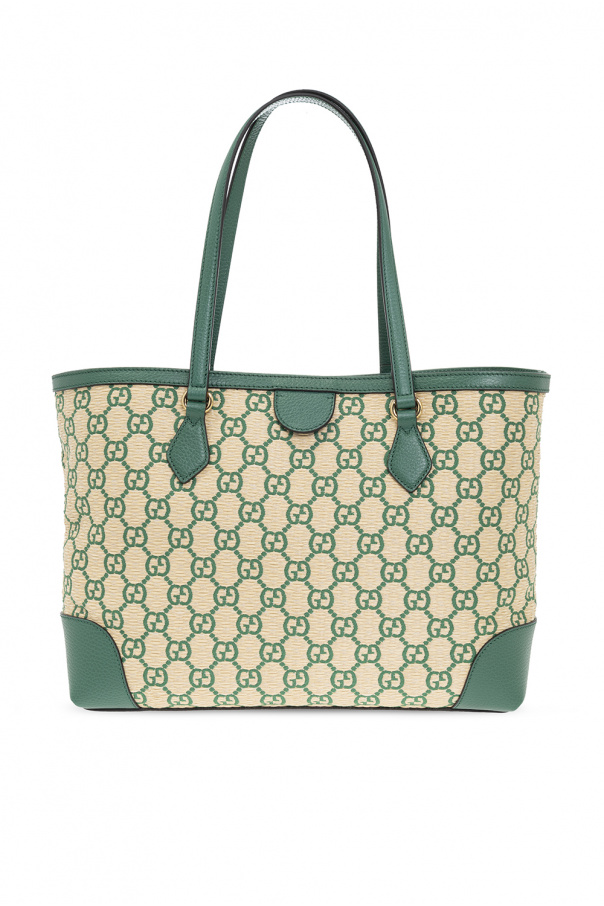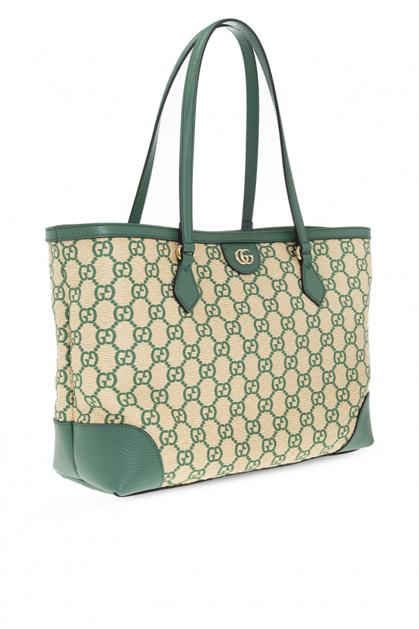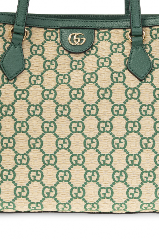 Light beige and green ‘Ophidia Medium’ shopper bag from Gucci. Crafted from faux straw with leather trims, this model features a magnetic snap, embroidered monogram pattern, GG logo appliqué, two half-round handles, gold-tone metal hardware and one internal compartment with brown leather lining, one slip pocket and one zip pocket.