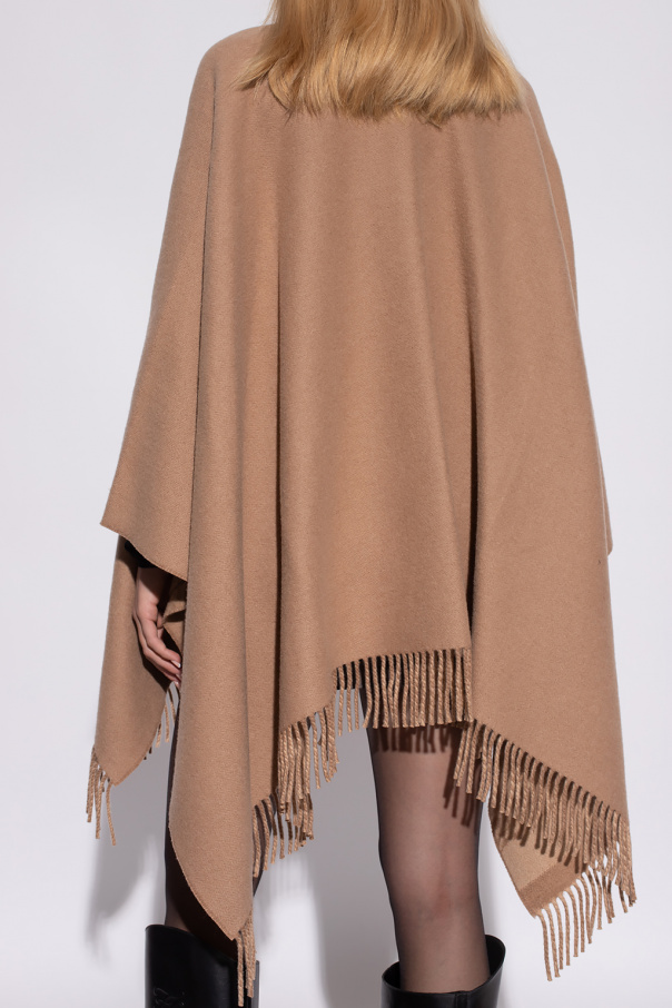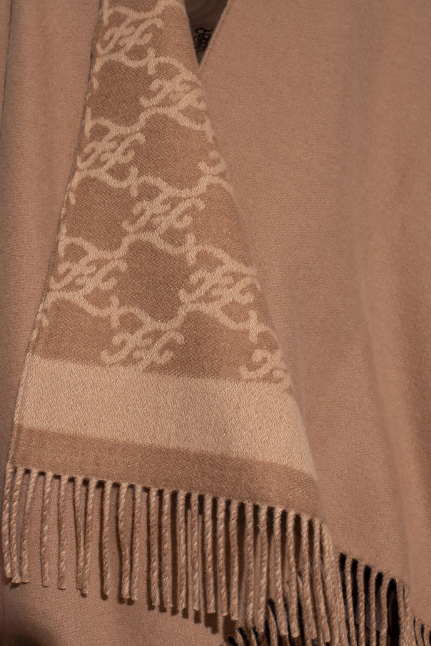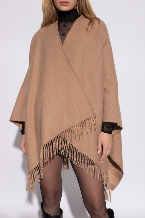 Beige poncho from Fendi. Crafted from a wool and cashmere blend, this garment features a lining with a logo pattern and fringe trims.