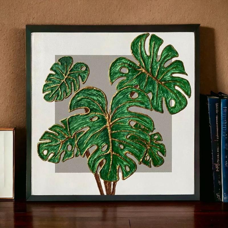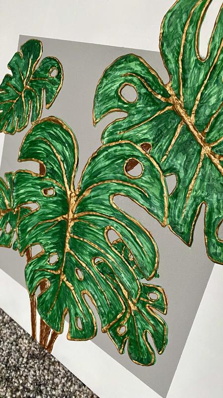 Листья монстера выполнены текстурной пастой, поэтому выглядят объемно